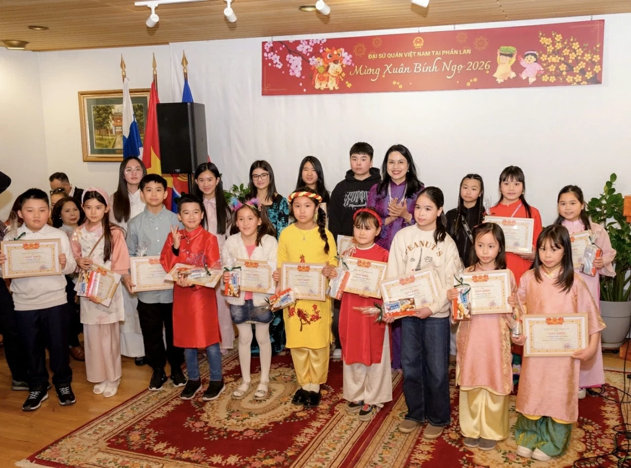 Nhân dịp này, Đại sứ Phạm Thị Thanh Bình trao giấy khen cho các em học sinh có thành tích tốt trong học tập tiếng Việt năm học 2025, đồng thời bày tỏ mong muốn tiếng Việt tiếp tục được gìn giữ và lan tỏa qua các thế hệ người Việt tại Phần Lan.
