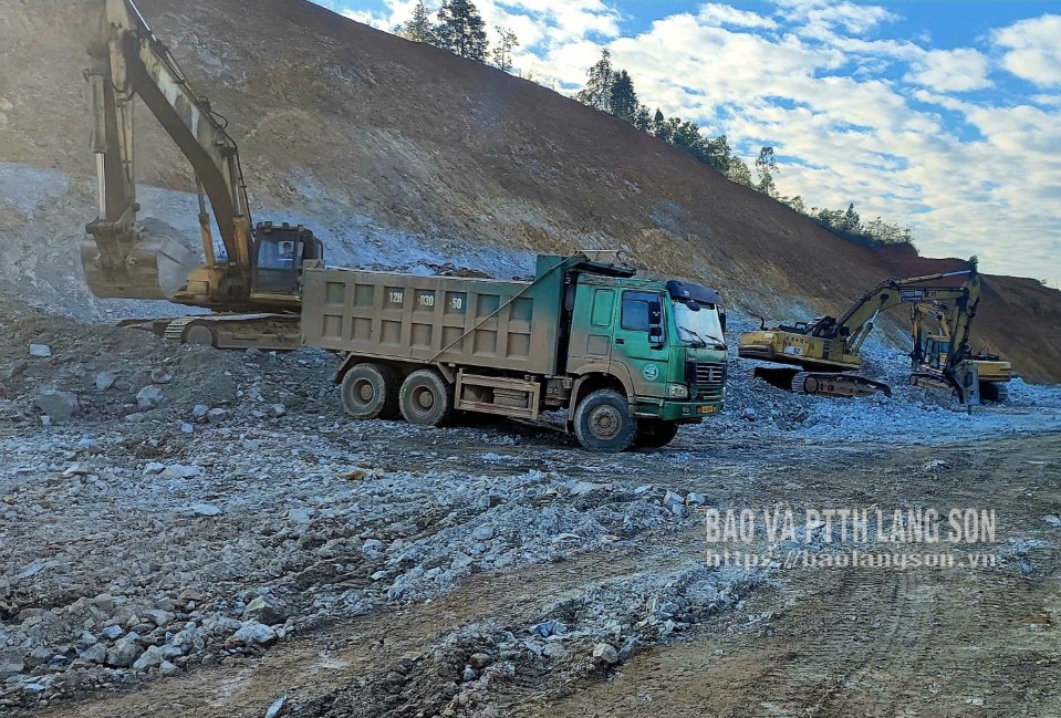 Công nhân thi công Dự án mở rộng đường chuyên dụng vận chuyển hàng hóa khu vực mốc 1119-1120 Cửa khẩu Quốc tế Hữu Nghị