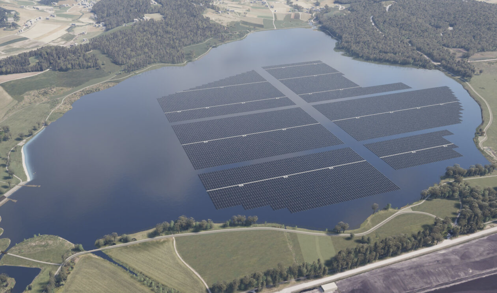 Nhà máy điện mặt trời nổi Družmirje (PSE Družmirje) dự kiến sẽ bao phủ một nửa diện tích mặt hồ Družmirje - một hồ nước hình thành hàng thập kỷ qua từ khai thác than nâu, gần thị trấn Šoštanj, miền Bắc Slovenia.