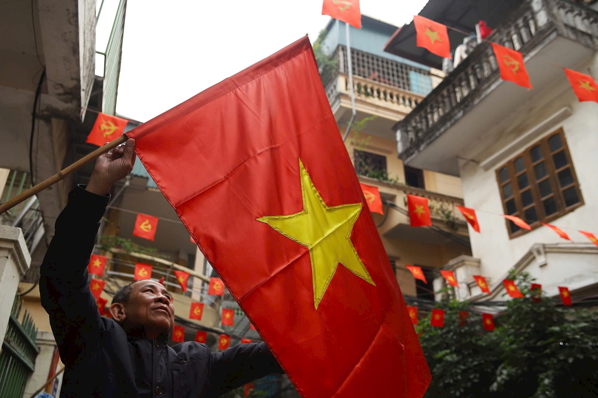 Người dân phường Ngọc Hà treo cờ Tổ quốc mừng Đảng, mừng Xuân. Ảnh: MH