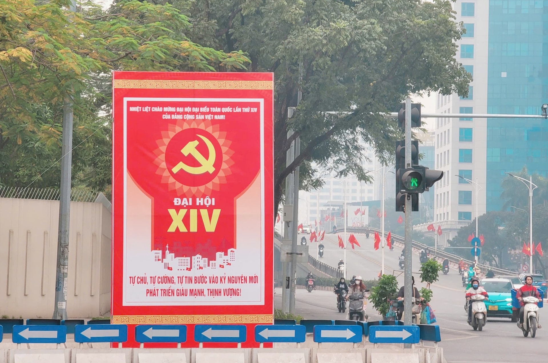 Banner cỡ lớn chào mừng Đại hội đại biểu toàn quốc lần thứ XIV tại nút giao Liễu Giai - Vạn Phúc. Ảnh: MH