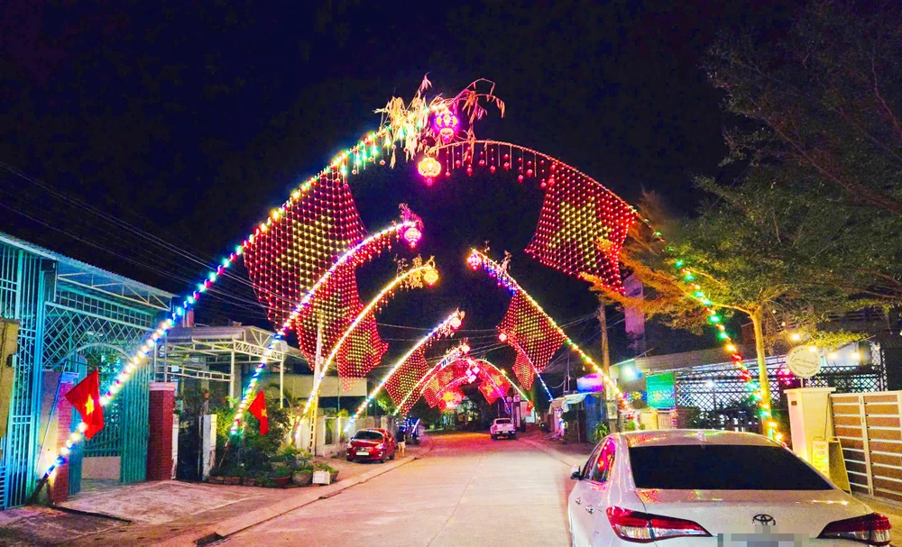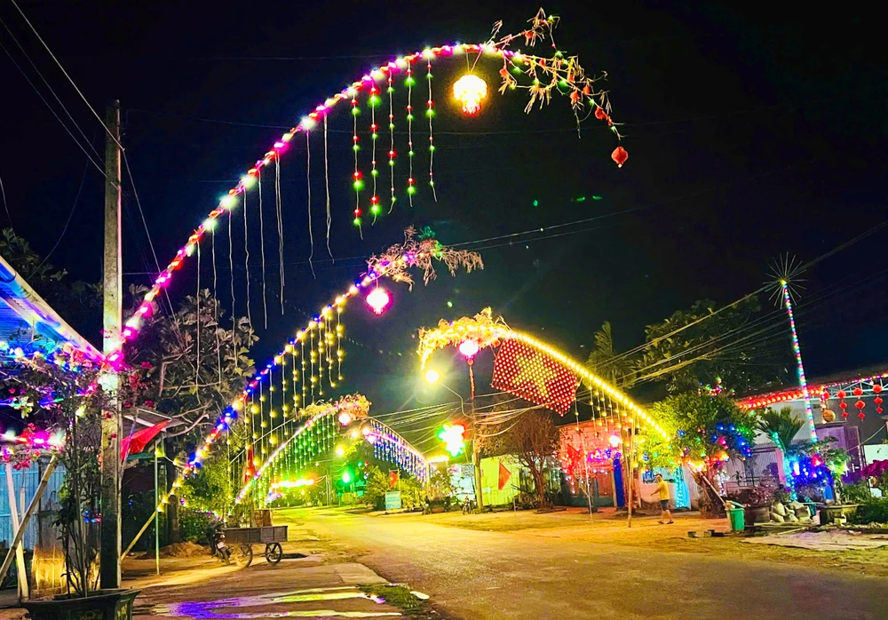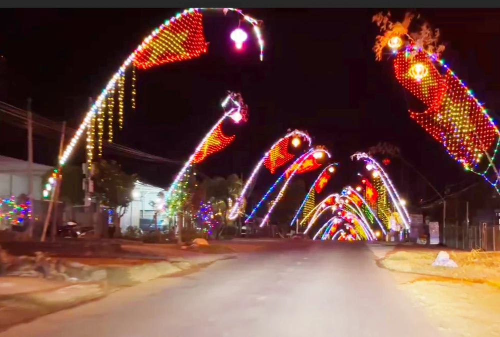 Nhiều tuyến đường, cây nêu được trang trí đèn điện đẹp mắt.