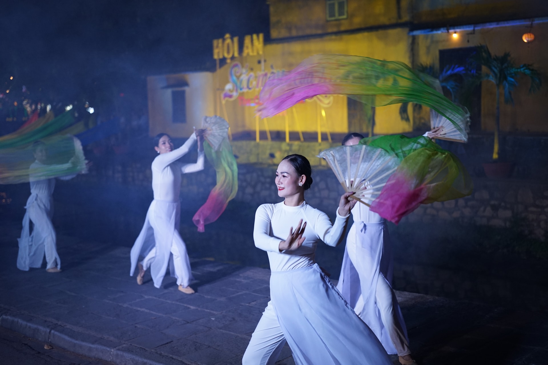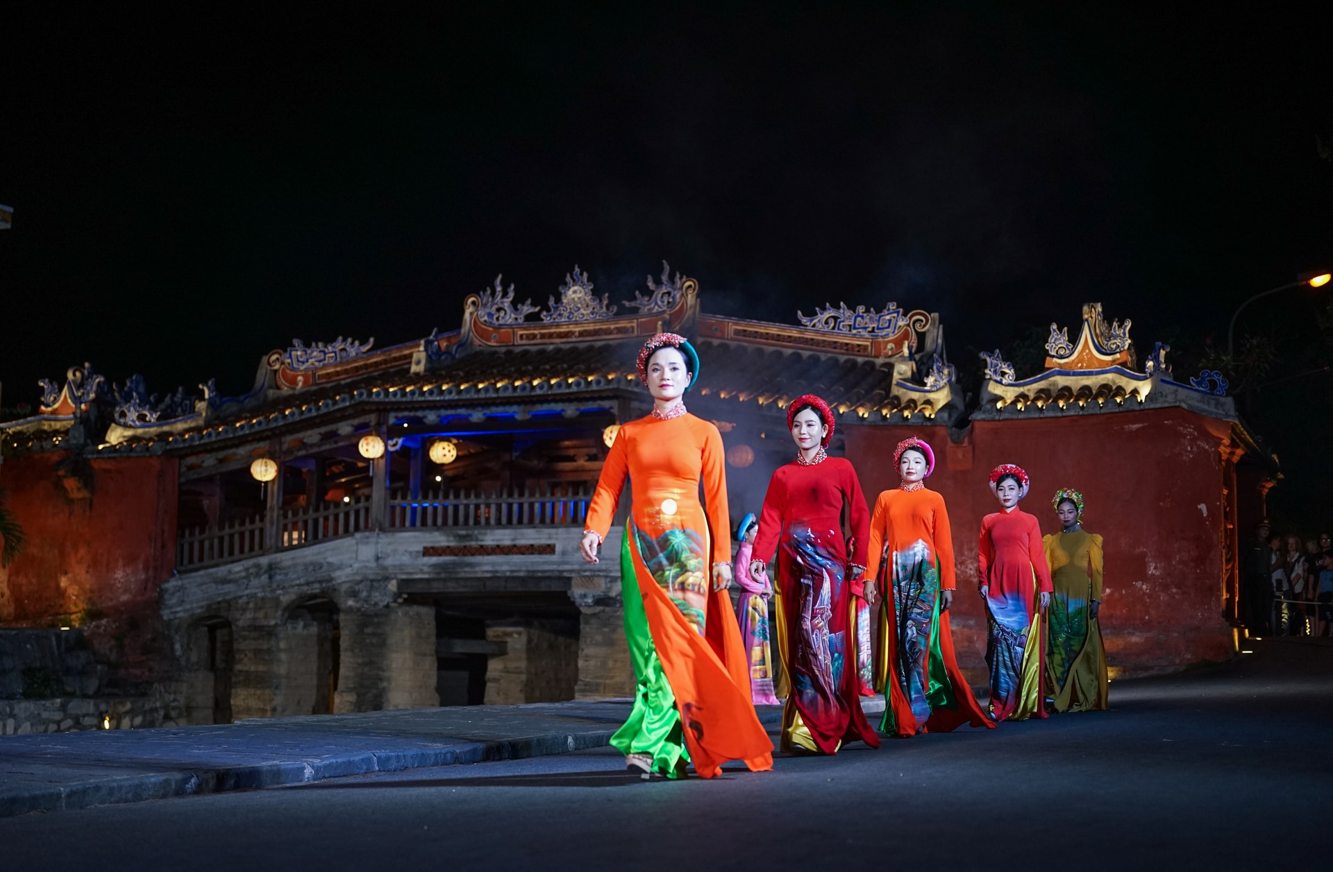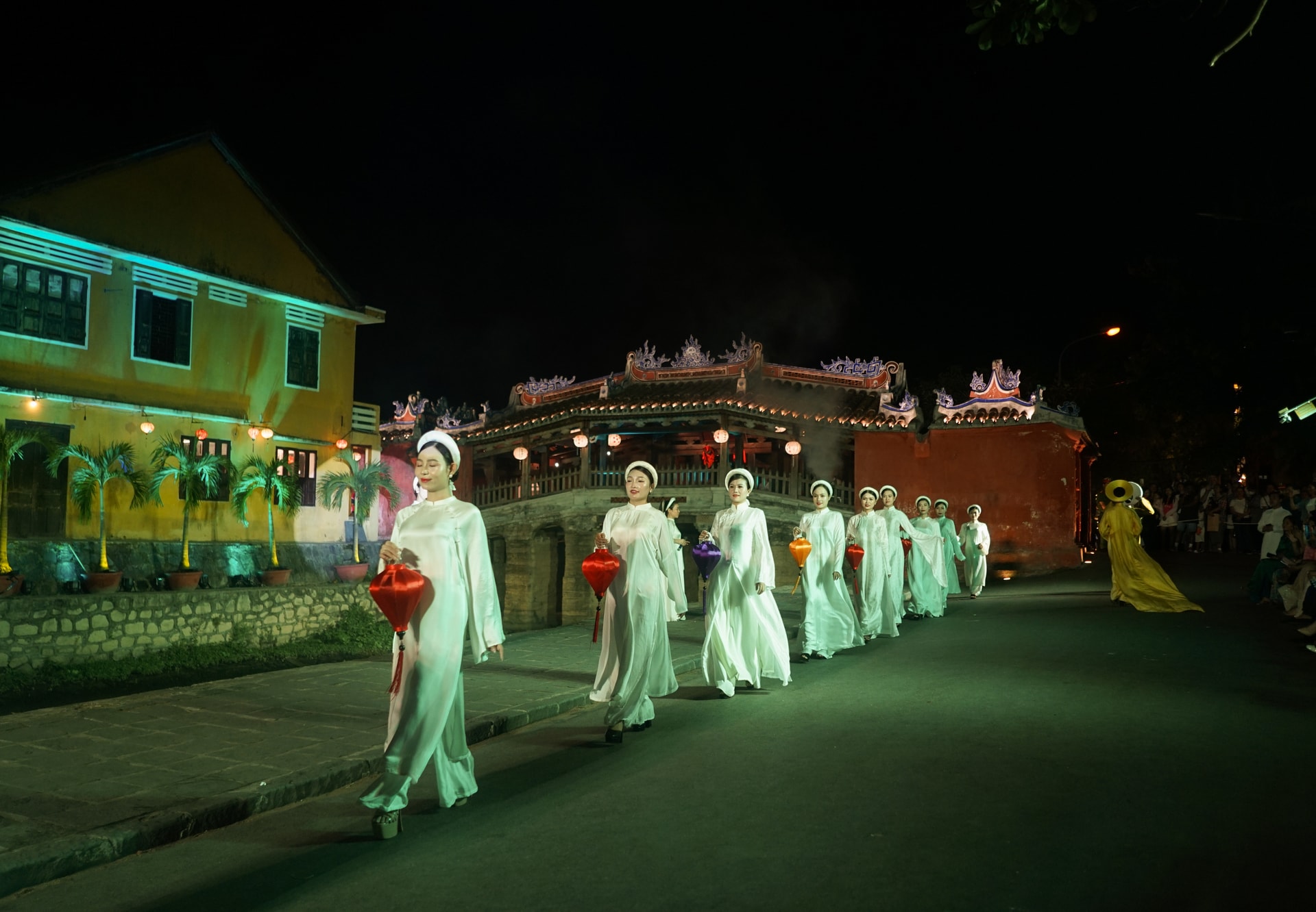 “Hội An - Sắc màu của lụa” diễn ra trong không gian cổ kính bên sông Hoài với điểm nhấn là di tích chùa Cầu. Ảnh: XUÂN SƠN