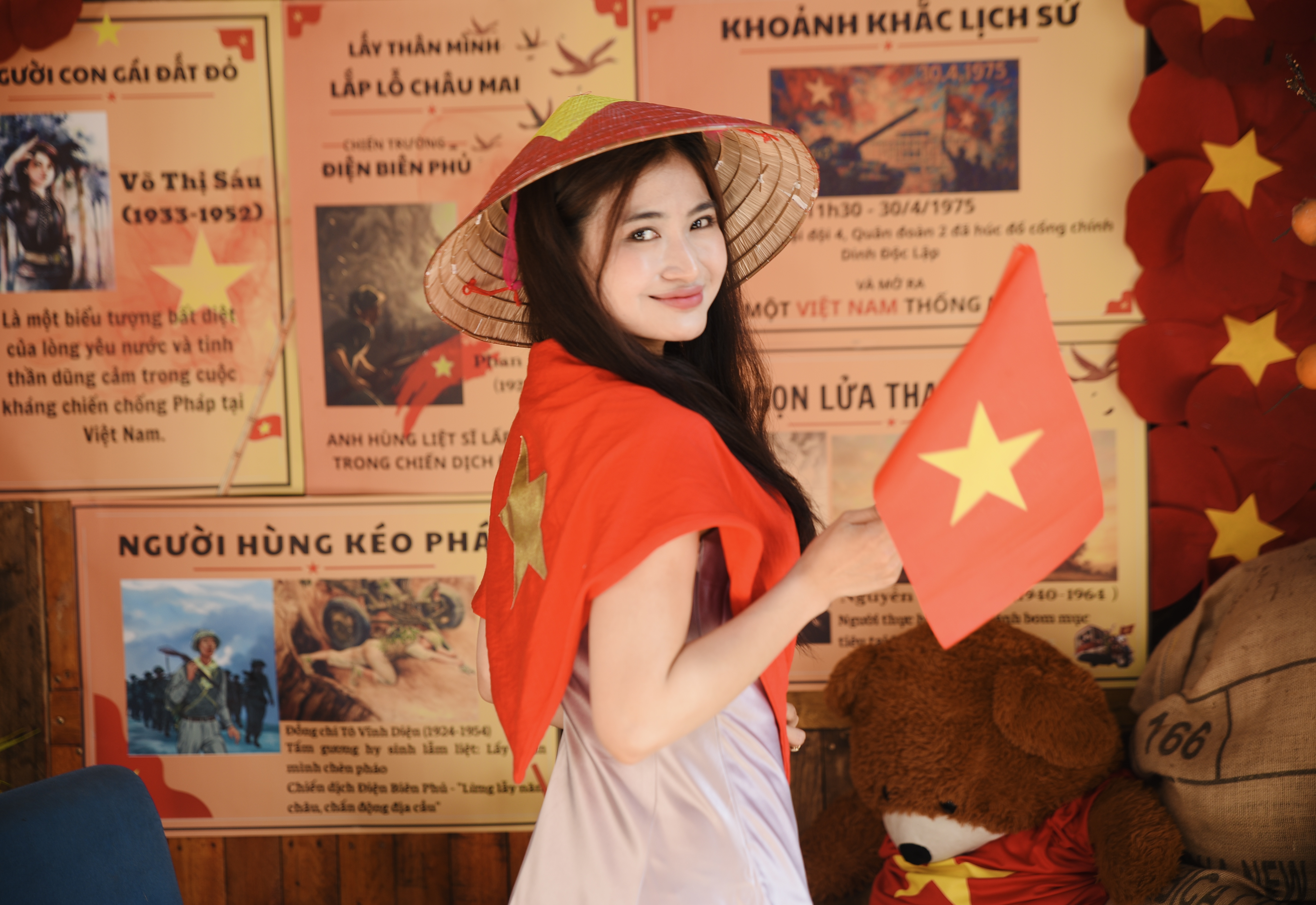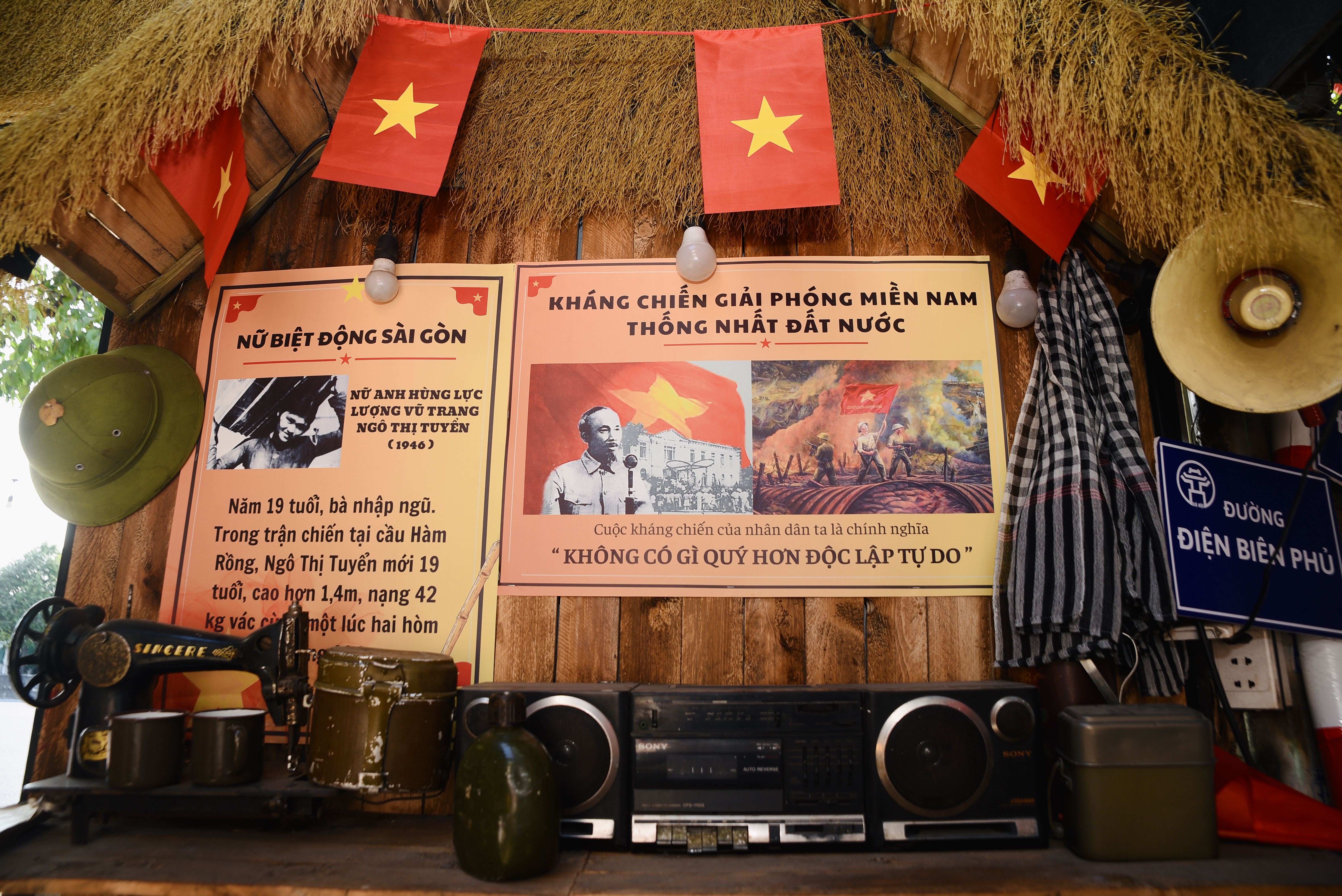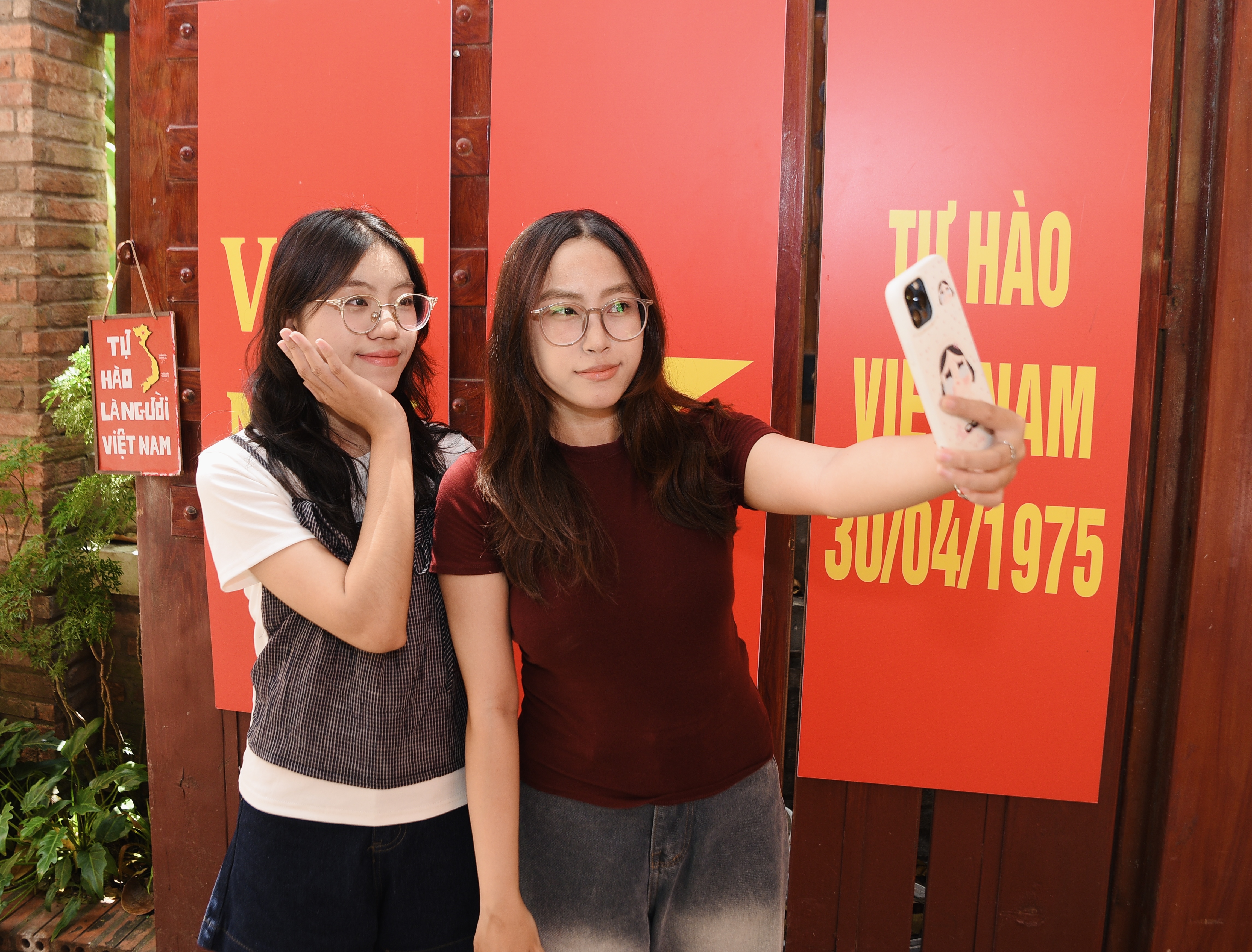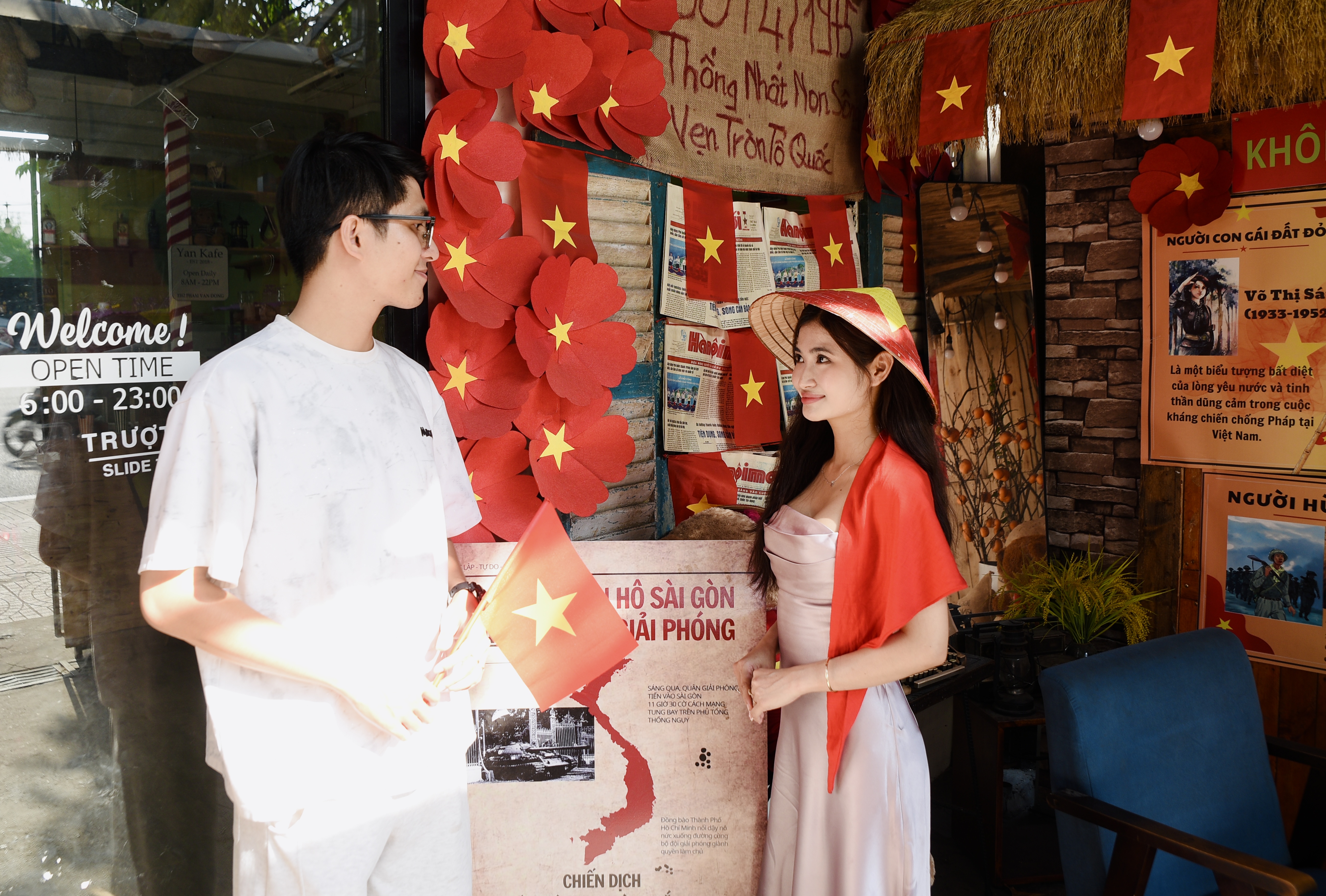 Tại Han Coffee (đường Phạm Văn Đồng, phường Hiệp Bình, TP.HCM) không gian được trang trí rực rỡ với cờ đỏ sao vàng, hoa giấy và các hình ảnh lịch sử, trở thành góc check-in thu hút nhiều bạn trẻ. Các bạn đến đây không chỉ để thưởng thức cà phê mà còn tranh thủ lưu lại những khoảnh khắc ý nghĩa trong dịp lễ 30-4.