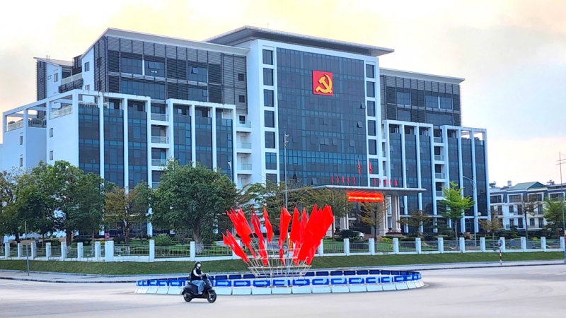 Khu vực trụ sở cơ quan được trang hoàng, tạo không khí phấn khởi hướng về sự kiện chính trị trọng đại của đất nước.
