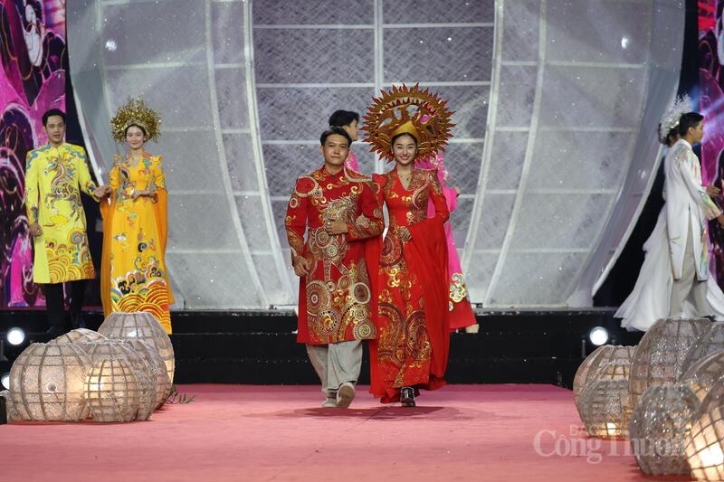 Cặp đôi người mẫu trong trang phục áo dài đỏ rực rỡ với họa tiết truyền thống làm nổi bật chủ đề “Sợi tơ vàng son - dệt nên khát vọng”.