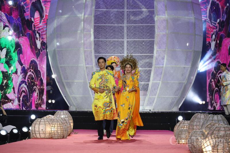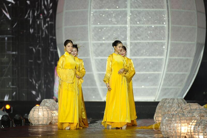 Các người mẫu trình diễn những thiết kế áo dài tinh xảo mang phong cách "vàng son" tại lễ khai mạc.