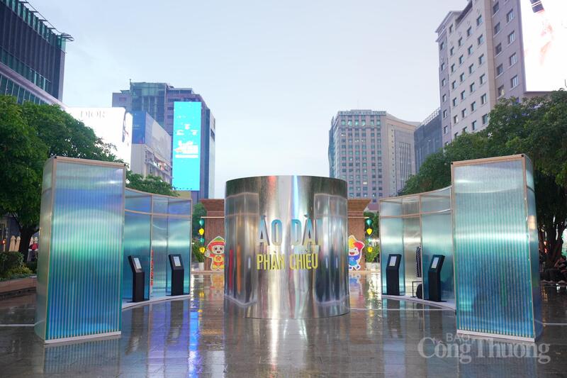 Không gian triển lãm nghệ thuật "Áo dài phản chiếu" hiện đại, tạo điểm nhấn check-in độc đáo cho du khách tại phố đi bộ Nguyễn Huệ.