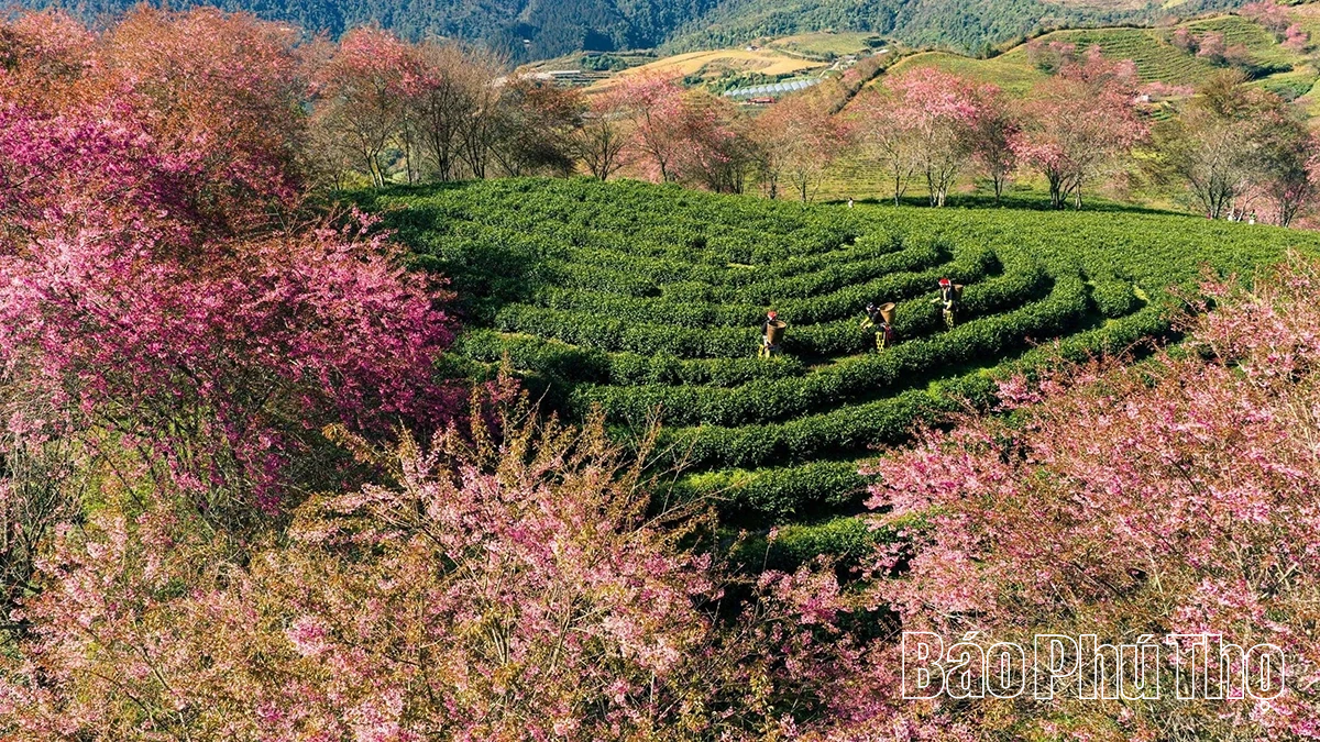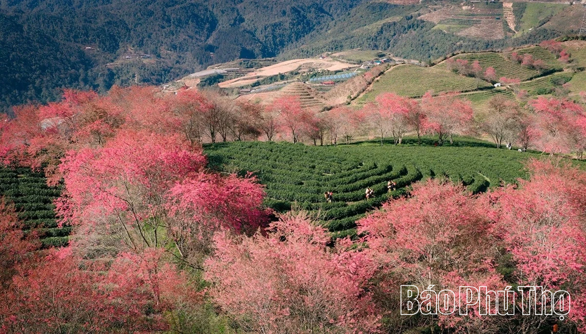 Những đồi chè rực rỡ sắc Mai anh đào đang mãn khai.