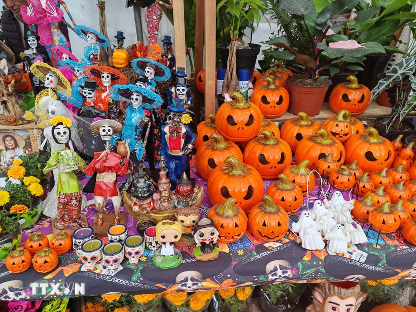 Các đồ trang trí được bày bán tại Hội chợ hoa Cempasúchil trước thềm lễ hội “Ngày người chết”. (Ảnh: Phương Lan/TTXVN)