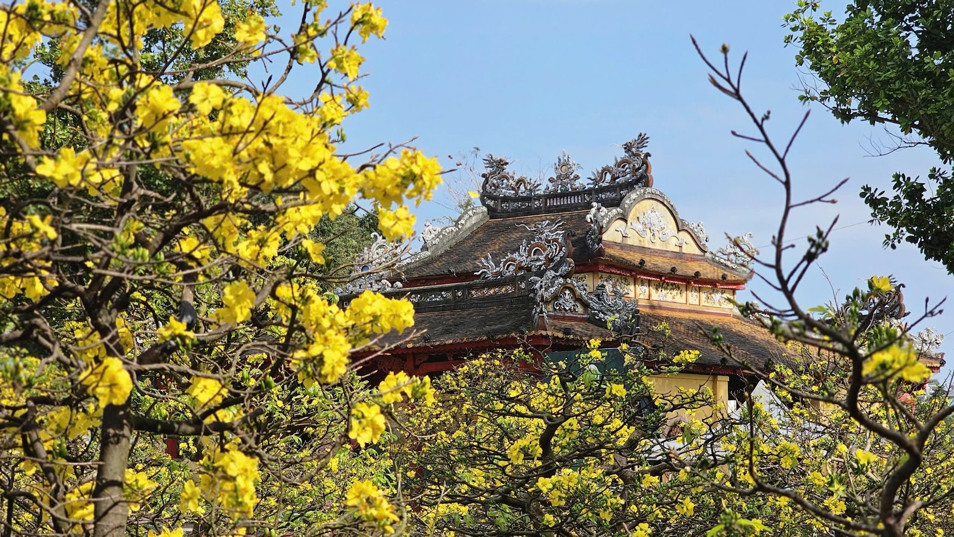Trong không gian cổ kính bên bờ sông Hương thơ mộng, sắc vàng hoàng mai nổi bật trên nền cỏ xanh và kiến trúc di sản, tạo nên bức tranh xuân vừa trang nghiêm vừa lãng mạn.