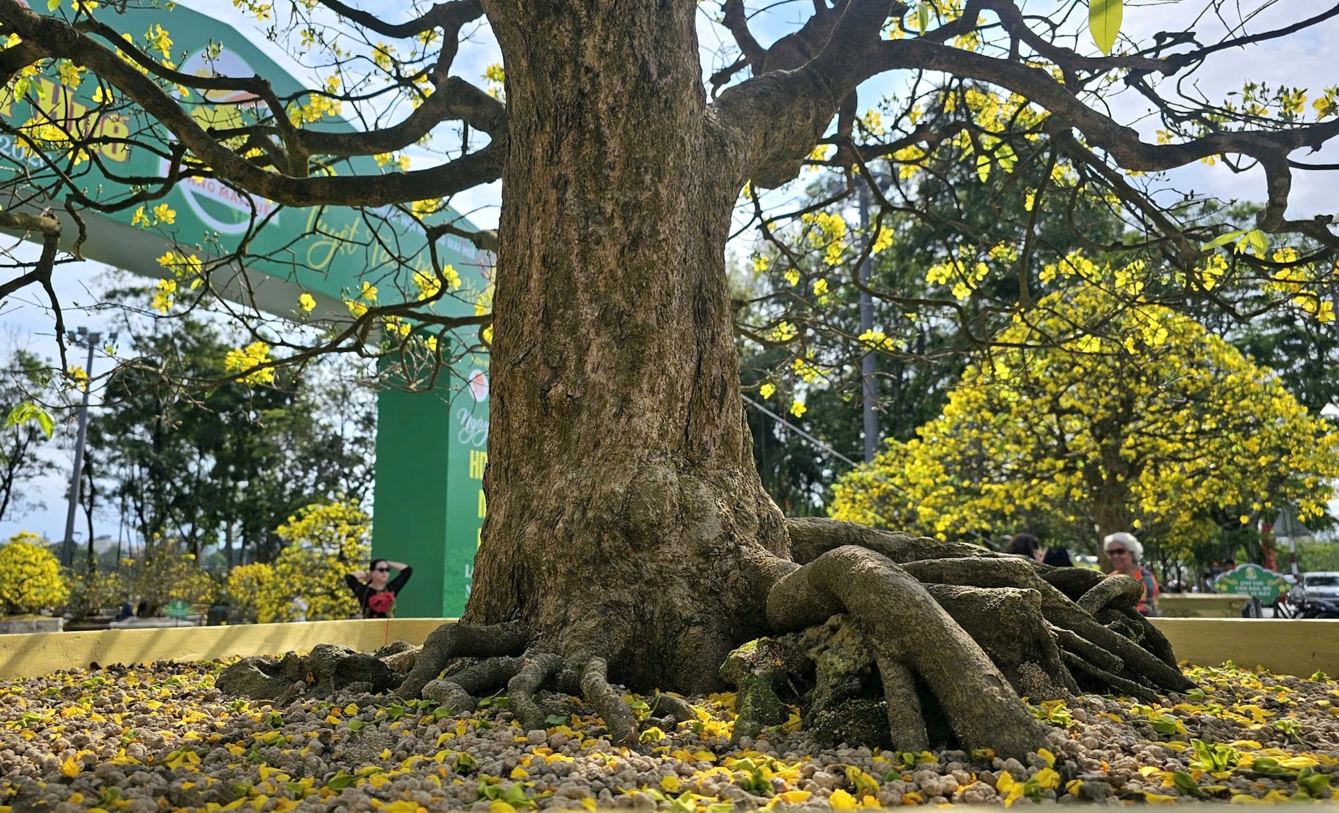 Nhiều gốc hoàng mai cổ thụ được trưng bày tại vị trí trang trọng giữa Phu Văn Lâu, thân cây xoắn vặn, vỏ nứt nẻ nhuốm màu thời gian như minh chứng cho sức sống bền bỉ qua hàng thập kỷ, thậm chí cả thế kỷ.