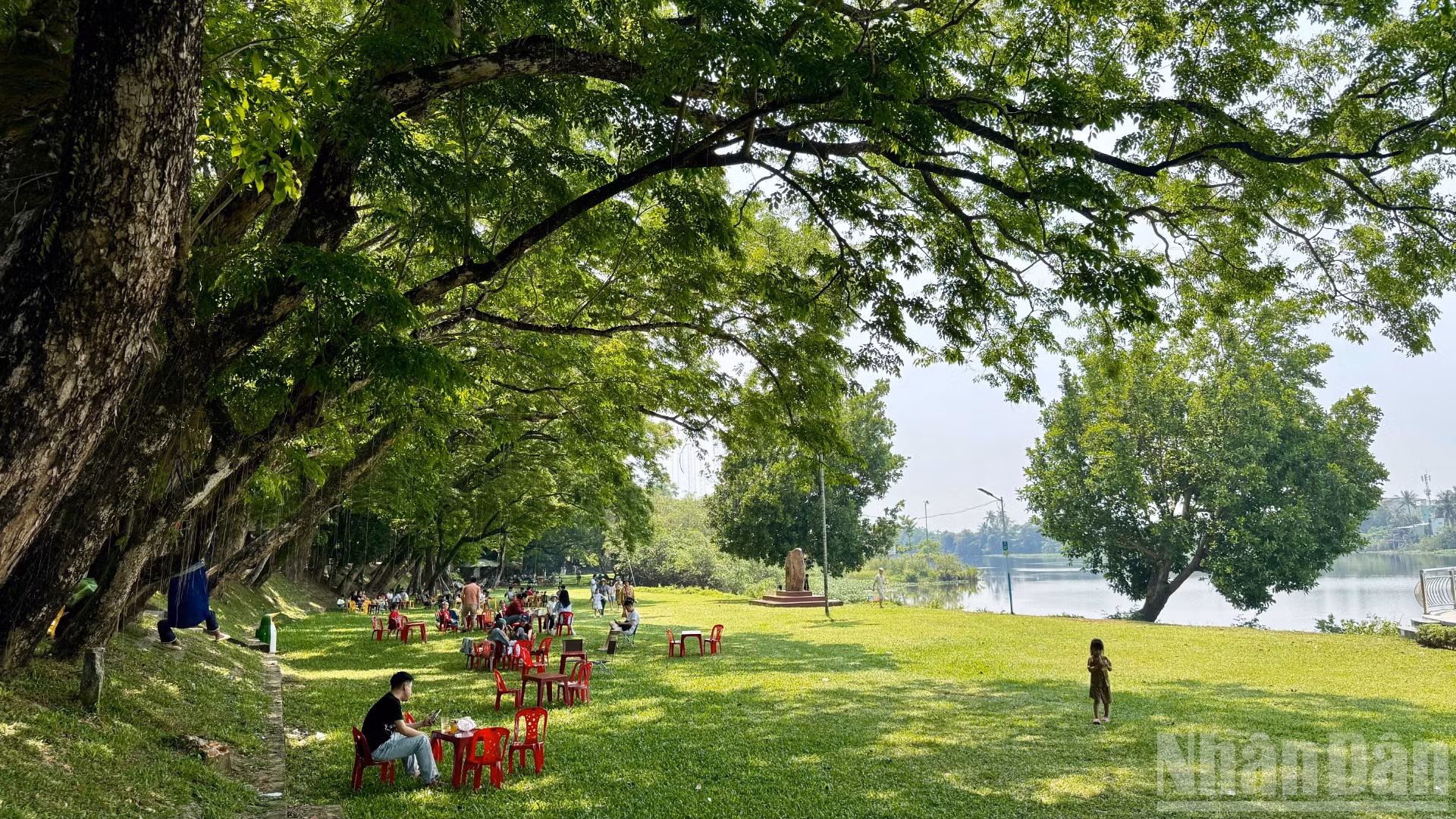 Du khách thích thú chụp ảnh bên bia đá quần thể cây Giáng Hương Ấn (cây sưa), Cây di sản Việt Nam ở vườn Cừa, phường Hương Trà.