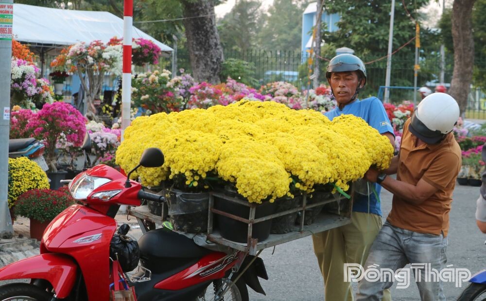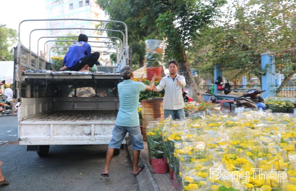 Tiểu thương tất bật đưa các chậu bông từ trên xe xuống, sắp xếp trưng bày để bán.