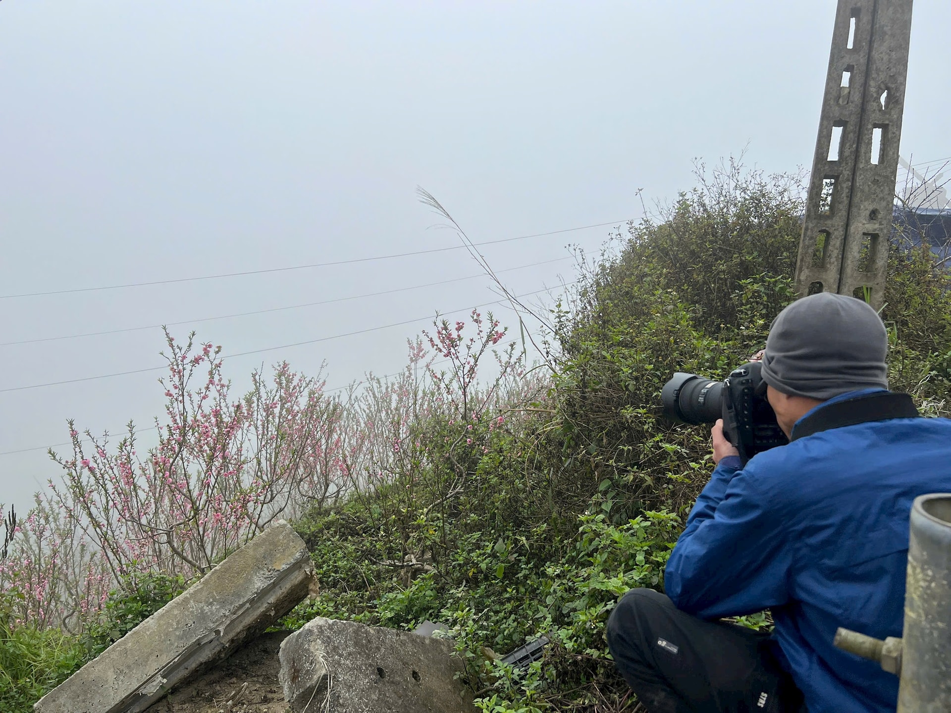 Anh Đỗ Tuấn Anh (du khách đến từ Hà Nội) say sưa sáng tác bên rừng đào nguyên sinh dưới chân đèo Ô Quy Hồ. Ảnh: Bảo Hân