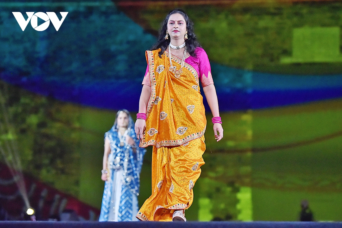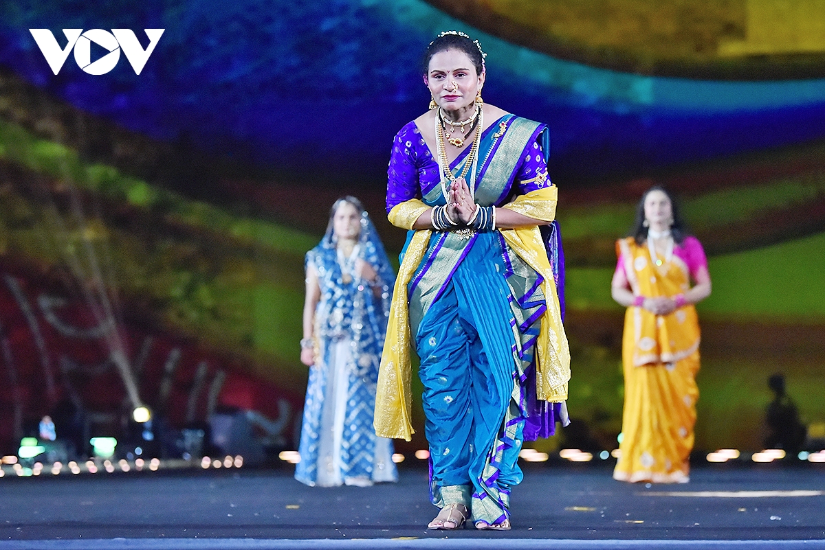 Mở màn phần trình diễn trang phục truyền thống của các quốc gia trên thế giới tại Chương trình trình diễn thời trang “Bước chân di sản – Sắc màu Việt Nam, Nhịp điệu thế giới”, Ấn Độ mang đến cho khán giả cảm nhận về sự đa dạng văn hóa và truyền thống.