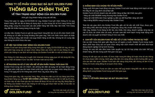 Cùng với Hanagold, Công ty Cổ phần Vàng bạc Đá quý Golden Fund hiện cũng gặp sự cố nghiêm trọng khiến người dùng hoang mang. Trụ sở chính của công ty ghi nhận theo website chính thức tại số 541 Vũ Tông Phan (Thanh Xuân, Hà Nội) đã đóng cửa từ 2 năm trước, khiến khách hàng không thể thực hiện các giao dịch trực tiếp hoặc nhận bàn giao vàng vật chất. Số điện thoại hotline được đăng trên website chính thức của công ty cũng không có phản hồi.