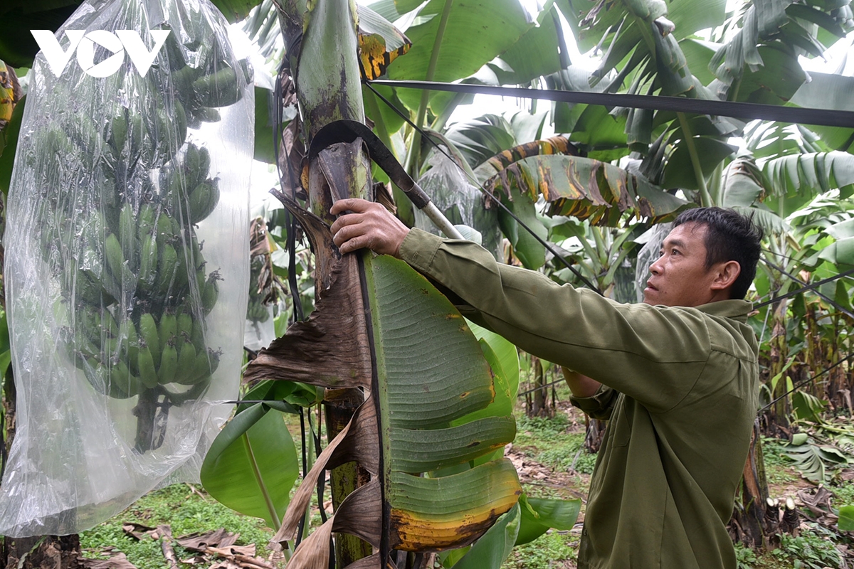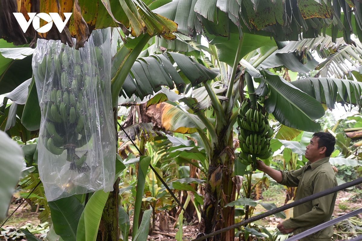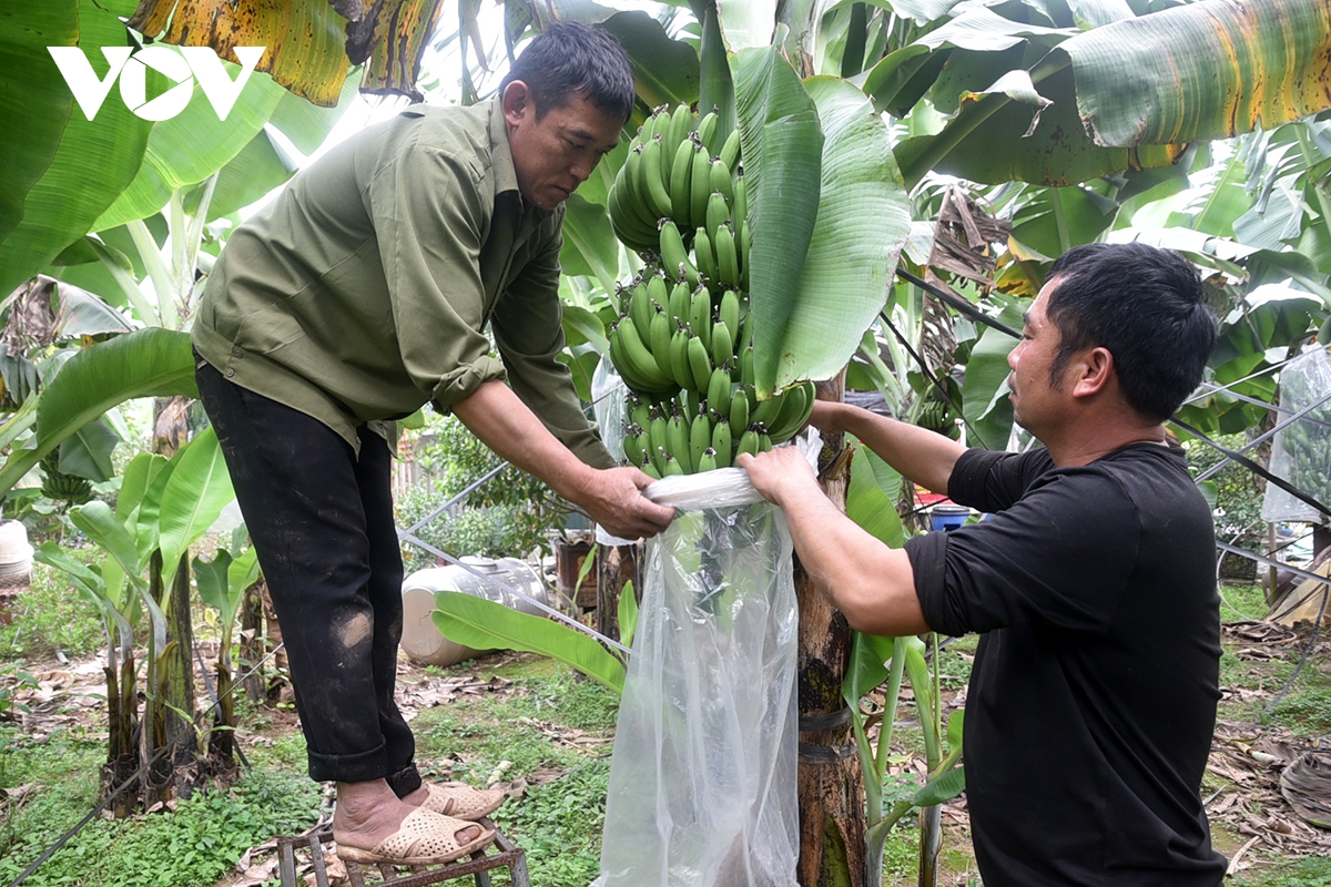 Bao buồng chuối nhằm tránh côn trùng và hạn chế tác động bất lợi của thời tiết, giúp quả phát triển đều, đẹp mã.