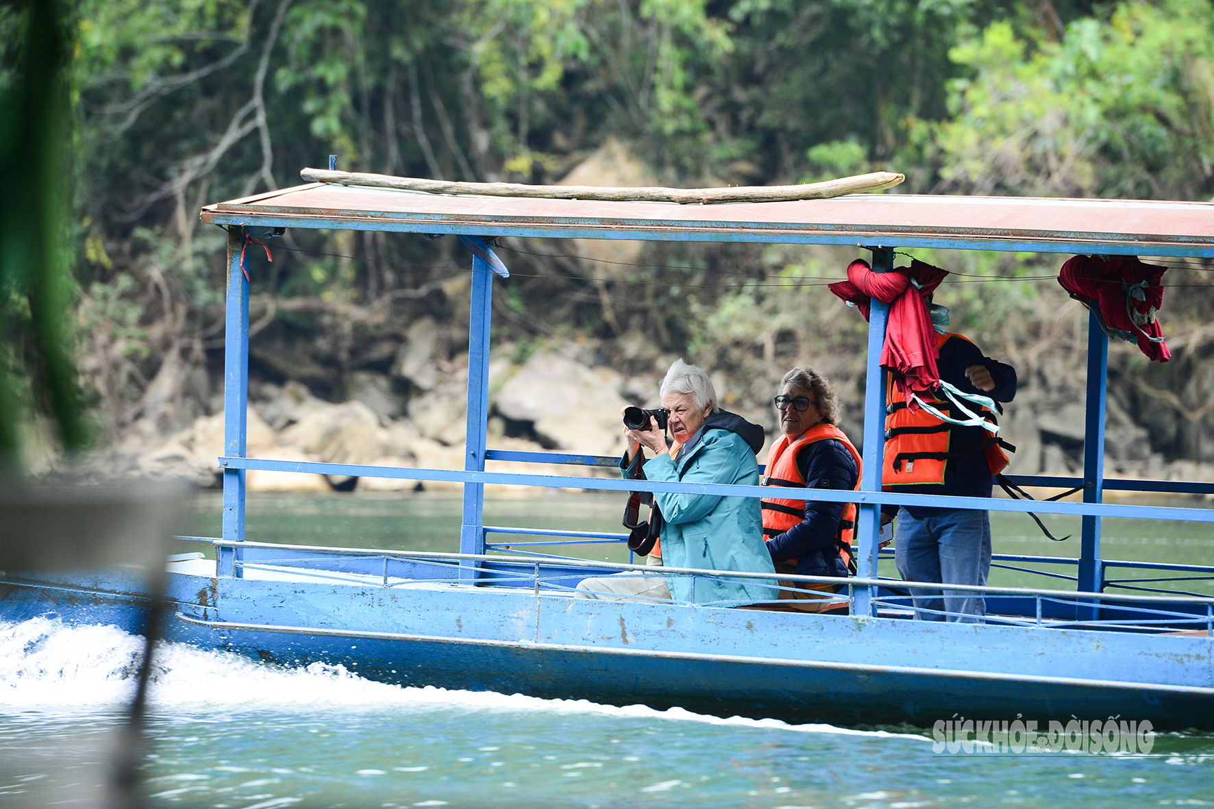 Du khách quốc tế ngắm cảnh và chụp ảnh khi thuyền xuôi nhẹ giữa lòng hồ Ba Bể trong buổi sáng mùa đông se lạnh.