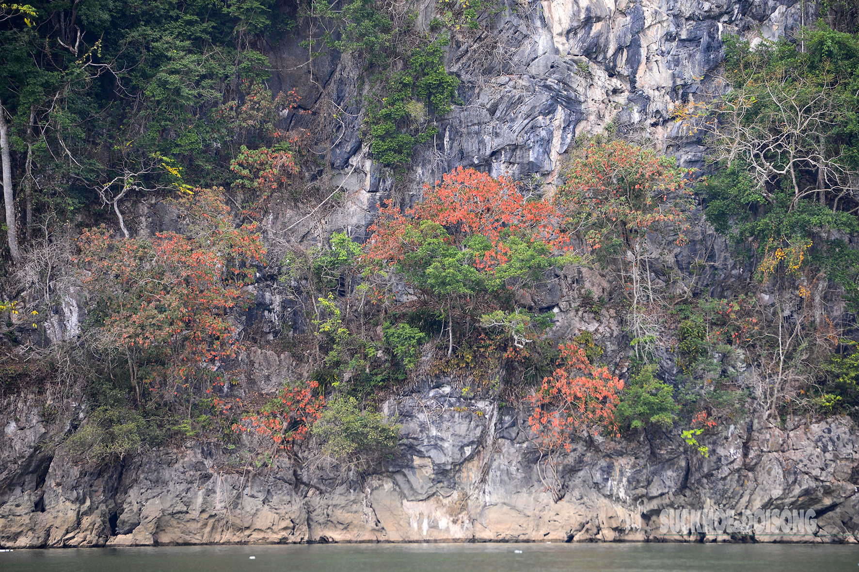 Vách núi đá vôi dựng đứng với những thân cây cổ thụ mọc cheo leo, đổi màu lá giữa mùa đông.