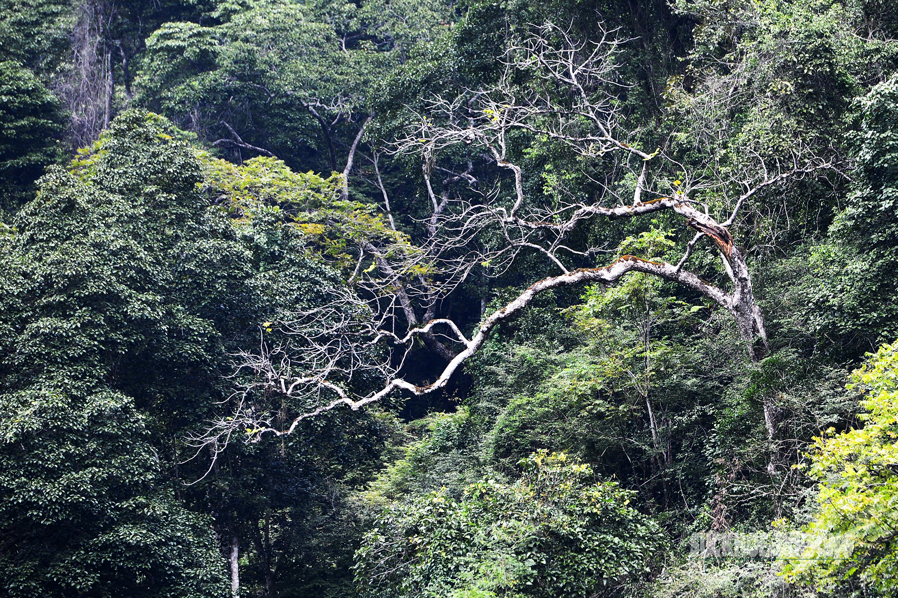 Mùa thay lá - thân và cành cây khẳng khiu, uốn lượn thành những đường cong mềm mại như một tác phẩm nghệ thuật vươn ra giữa nền rừng xanh thẫm.