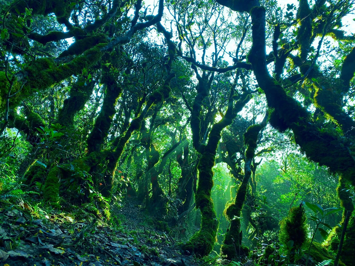 Những cây cổ thụ phủ kín rêu xanh mượt, đá tảng rêu phong nhẵn mịn, sương mù lững lờ trên từng ngọn cỏ, tạo nên khung cảnh như bước ra từ câu chuyện cổ tích. Ảnh Cuong Nguyen