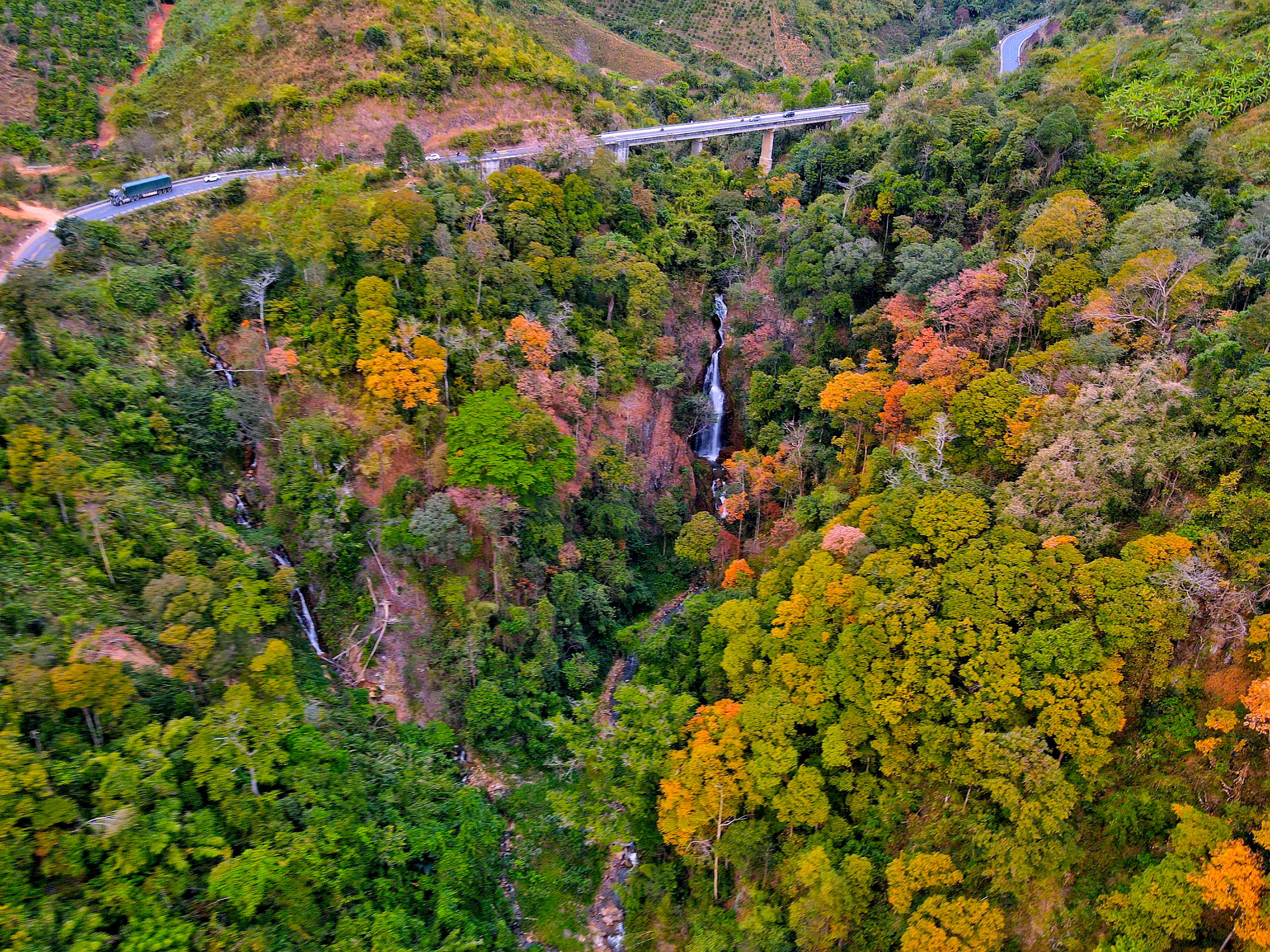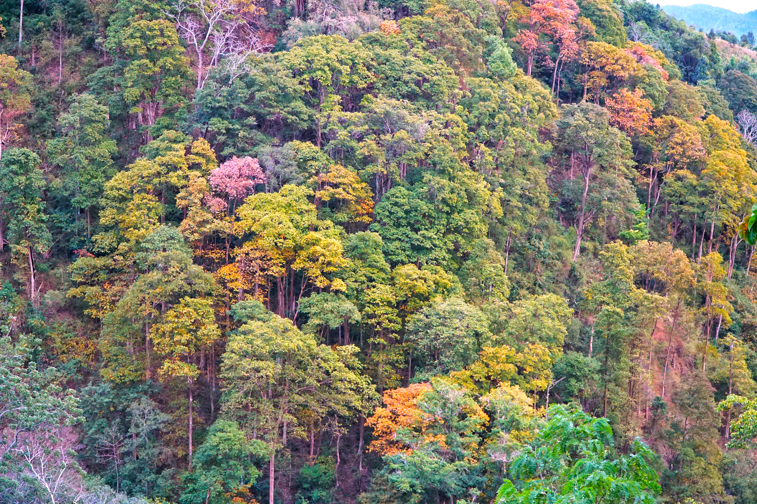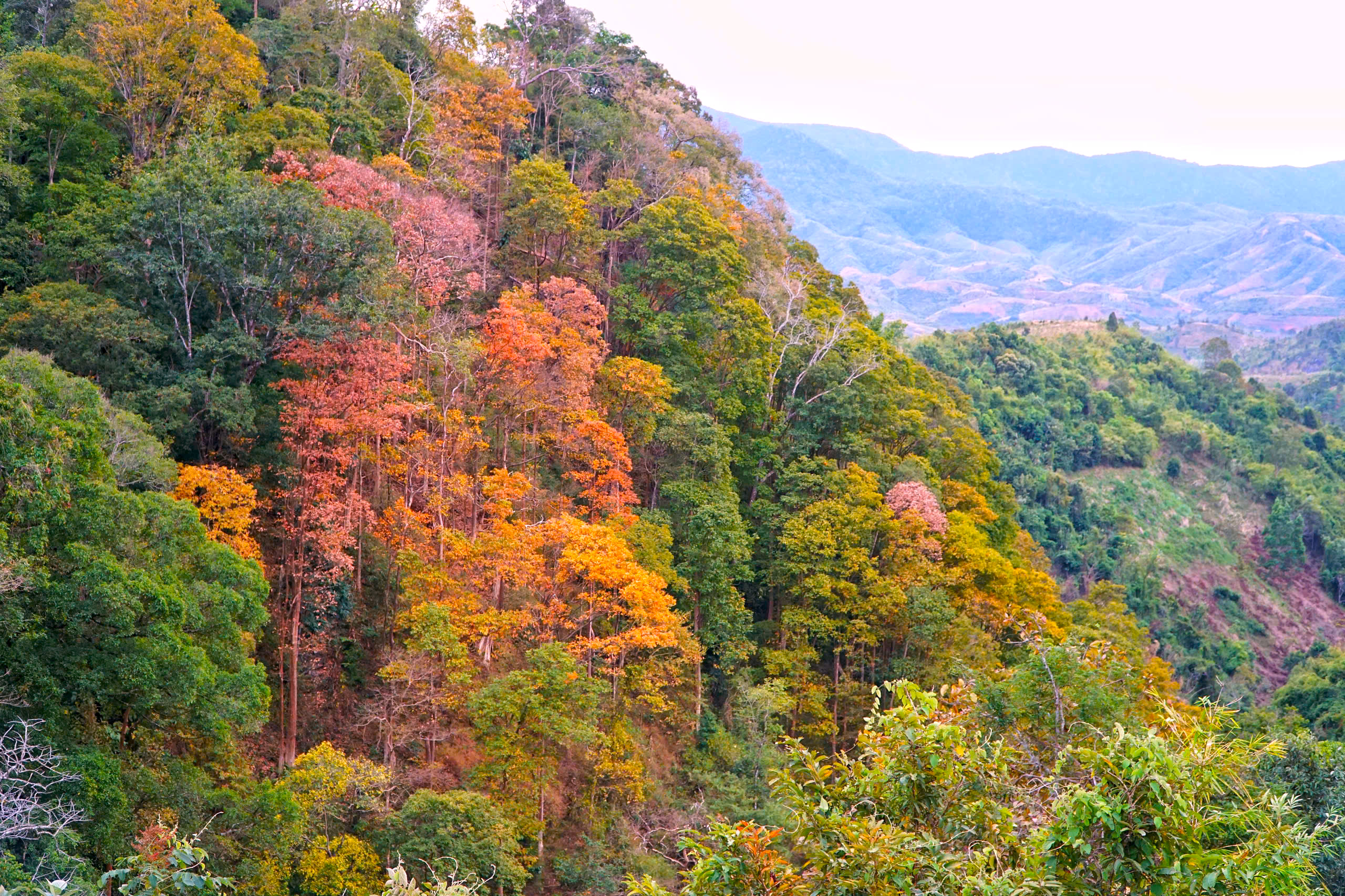 Thời điểm này, rừng tự nhiên dọc theo đèo bước vào giai đoạn chuyển mùa rõ nét. Nhiều cây gỗ đồng loạt thay lá, tạo nên những mảng màu đan xen giữa vàng, đỏ, cam và xanh, khiến cả khu rừng như khoác lên diện mạo mới. Nhìn từ xa, cảnh rừng gợi liên tưởng đến một bức tranh thiên nhiên sống động.