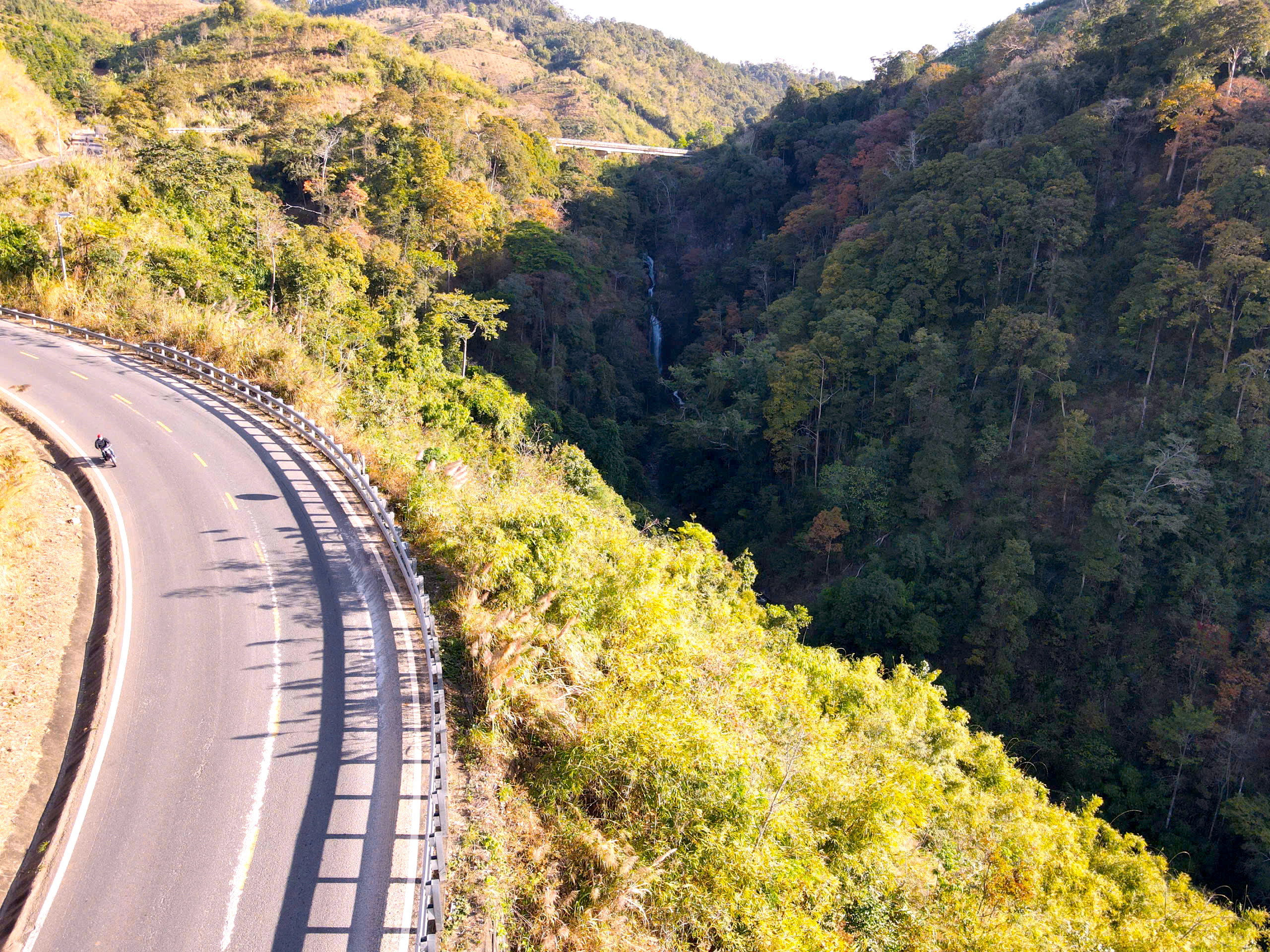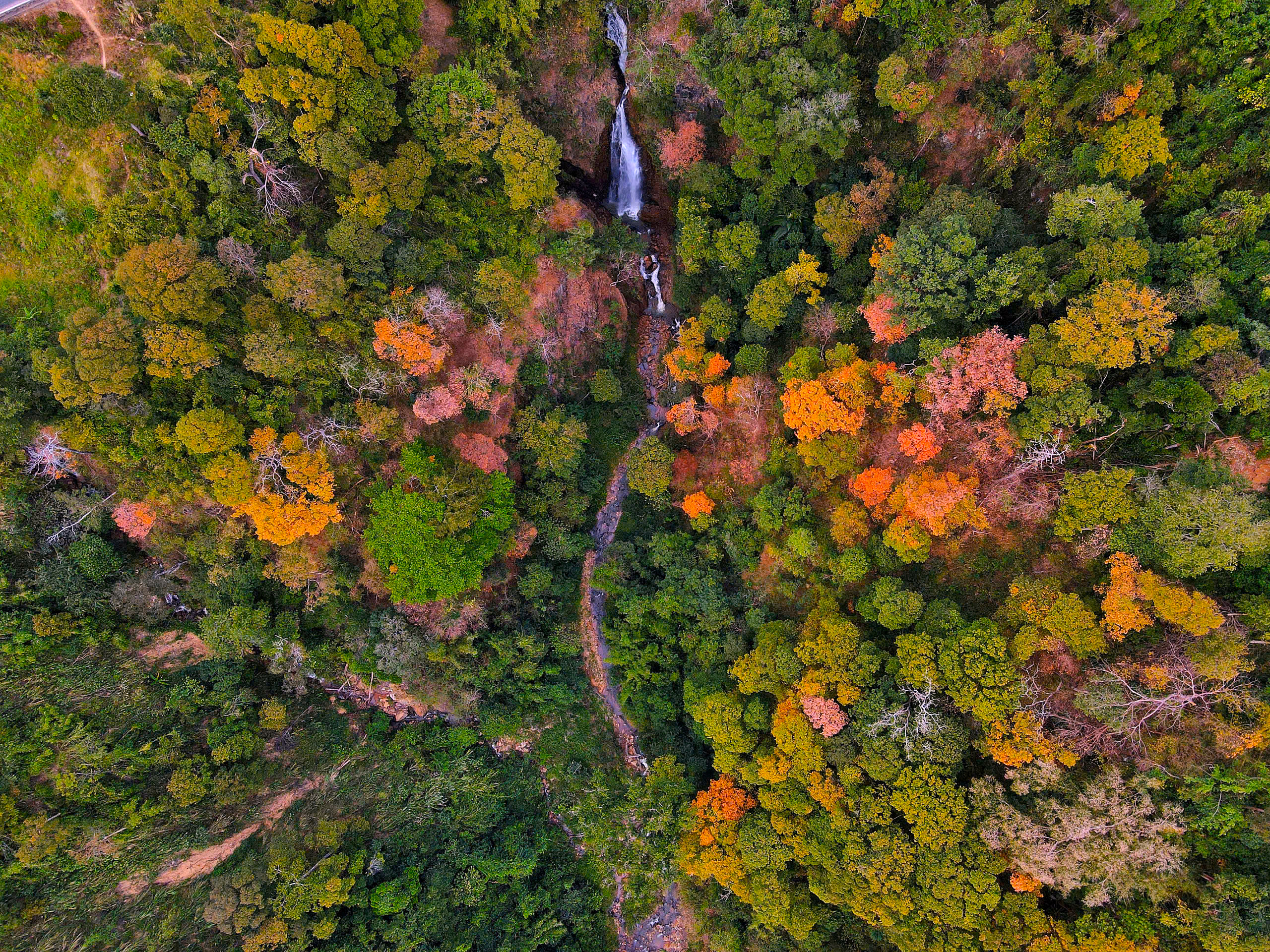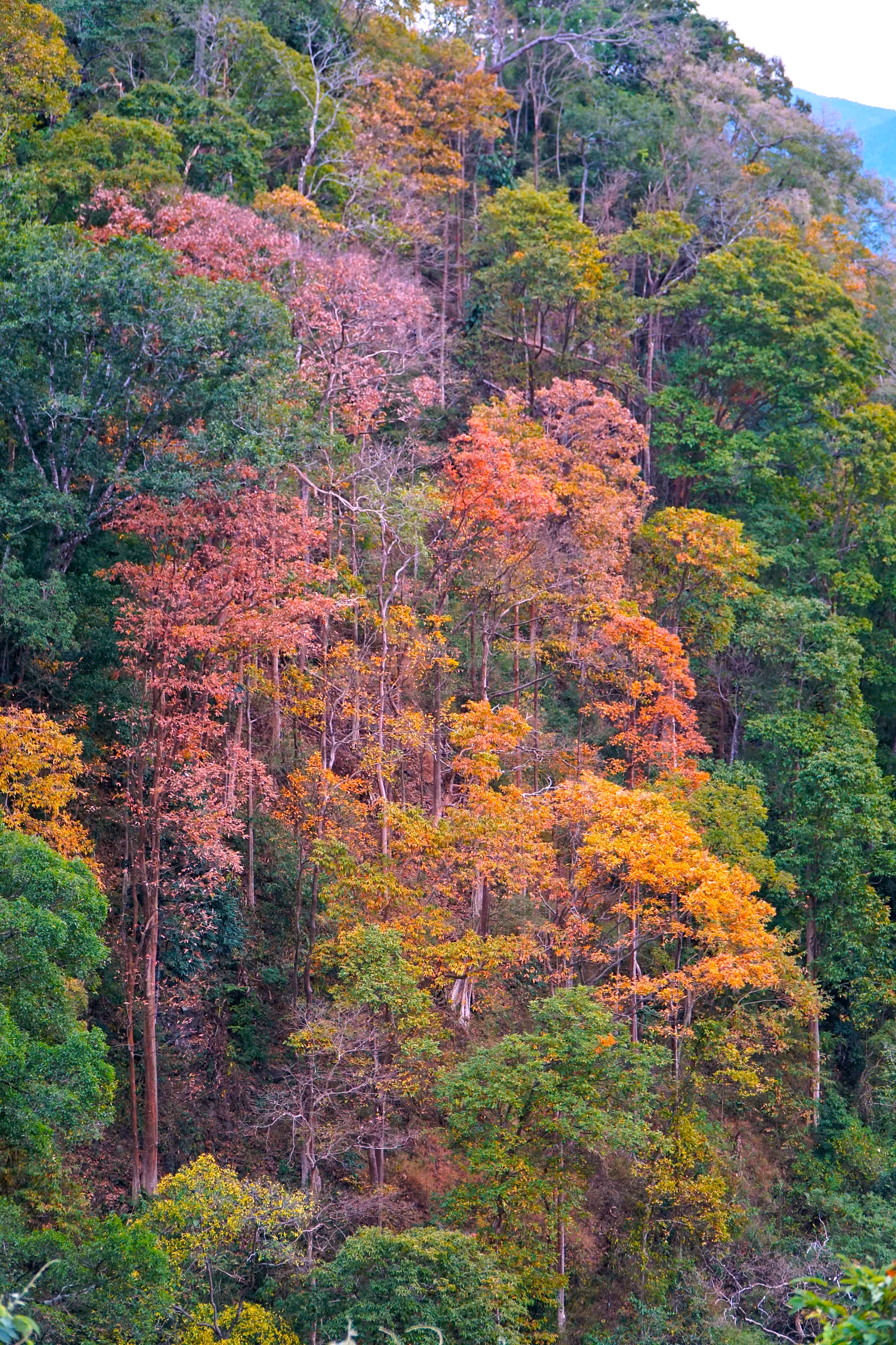 Thời điểm này, rừng tự nhiên dọc theo đèo bước vào giai đoạn chuyển mùa rõ nét. Nhiều cây gỗ đồng loạt thay lá, tạo nên những mảng màu đan xen giữa vàng, đỏ, cam và xanh, khiến cả khu rừng như khoác lên diện mạo mới. Nhìn từ xa, cảnh rừng gợi liên tưởng đến một bức tranh thiên nhiên sống động.