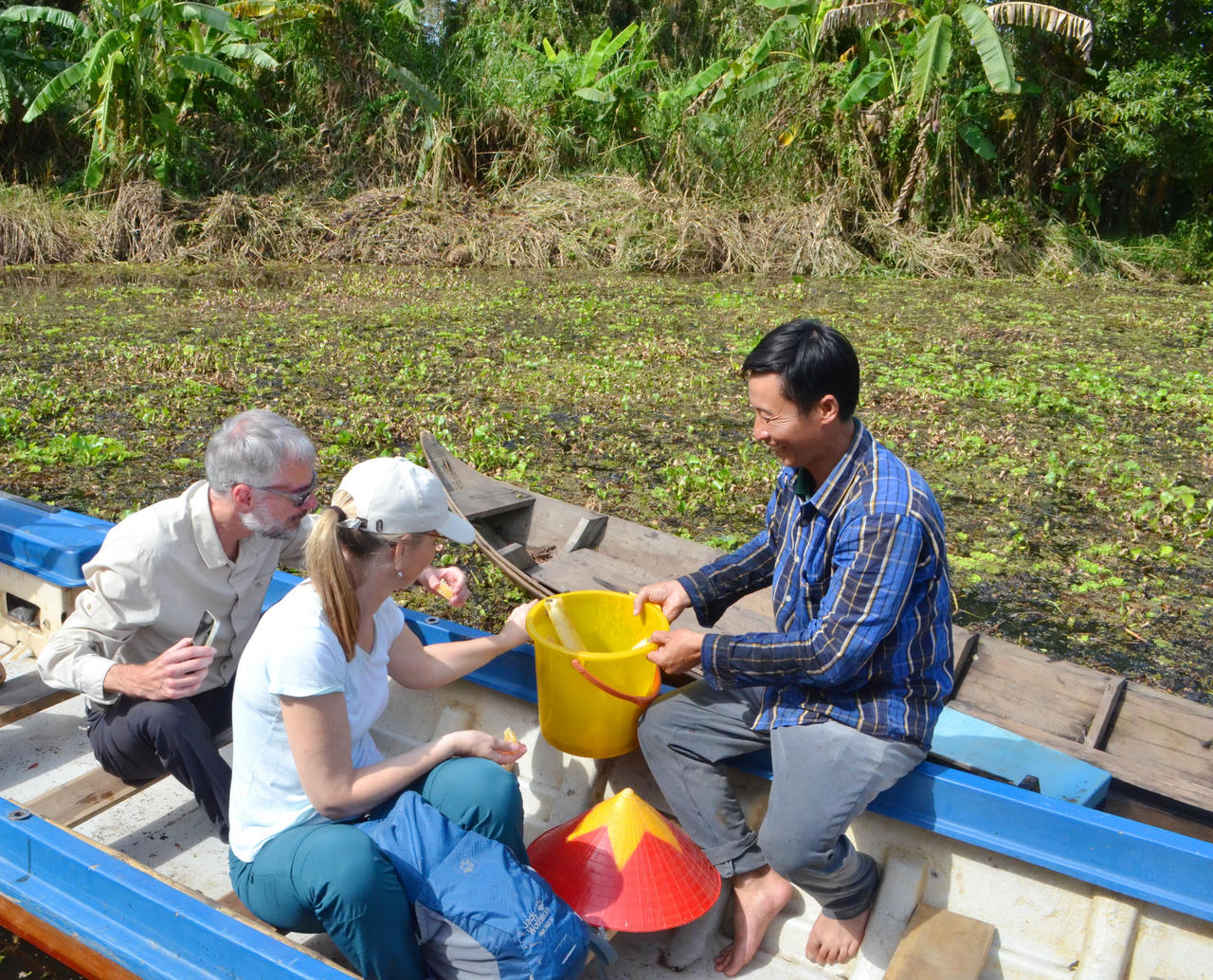 Ông Khanh và ông Hoàng bơi xuồng đưa chúng tôi len lỏi qua thảm bèo dày đặc, lau sậy, tiến sâu vào rừng tràm.