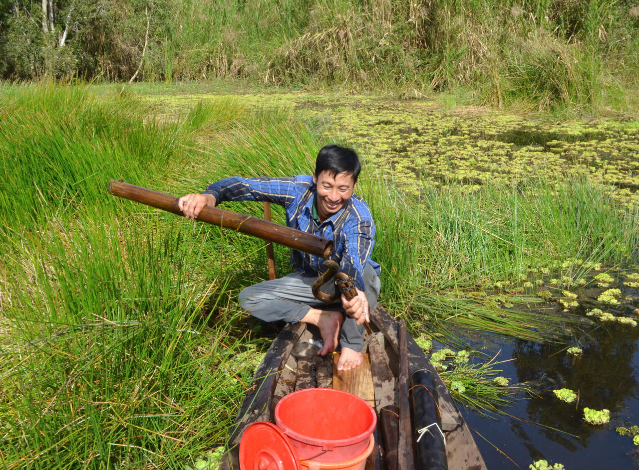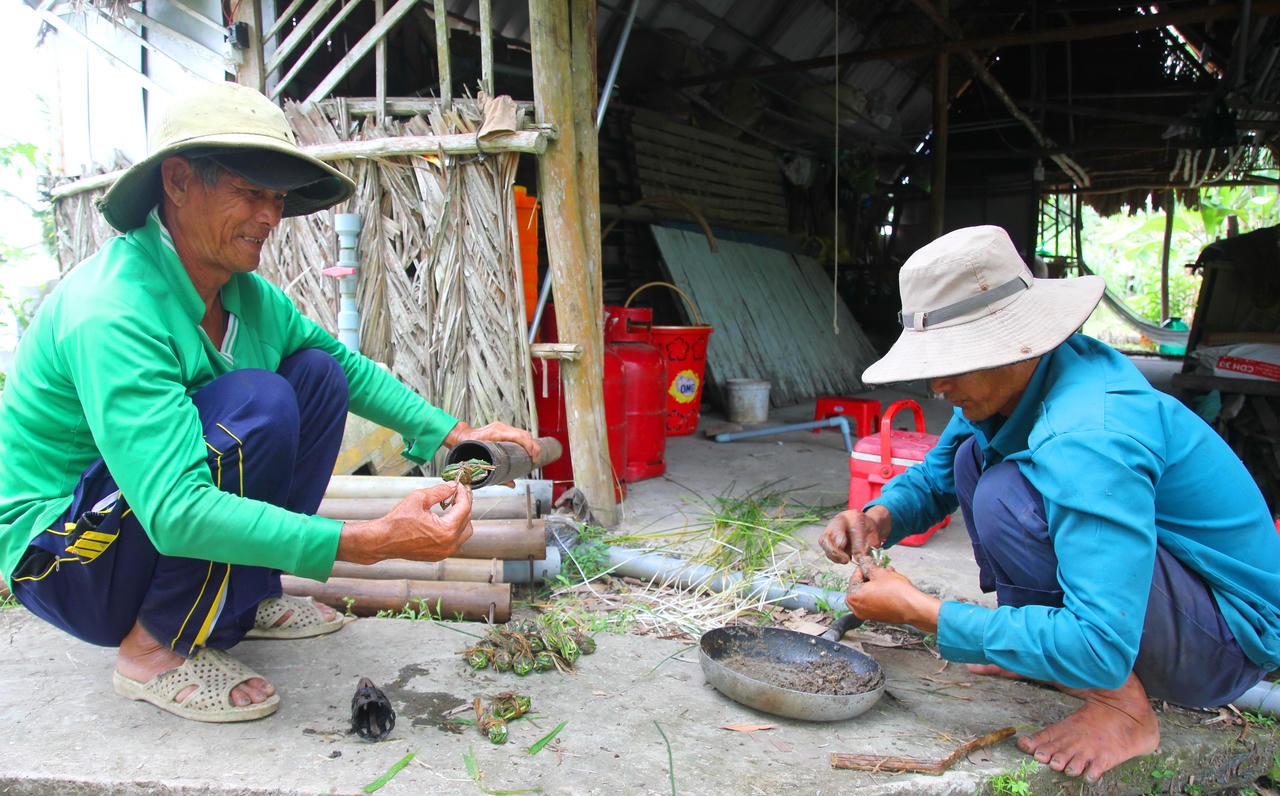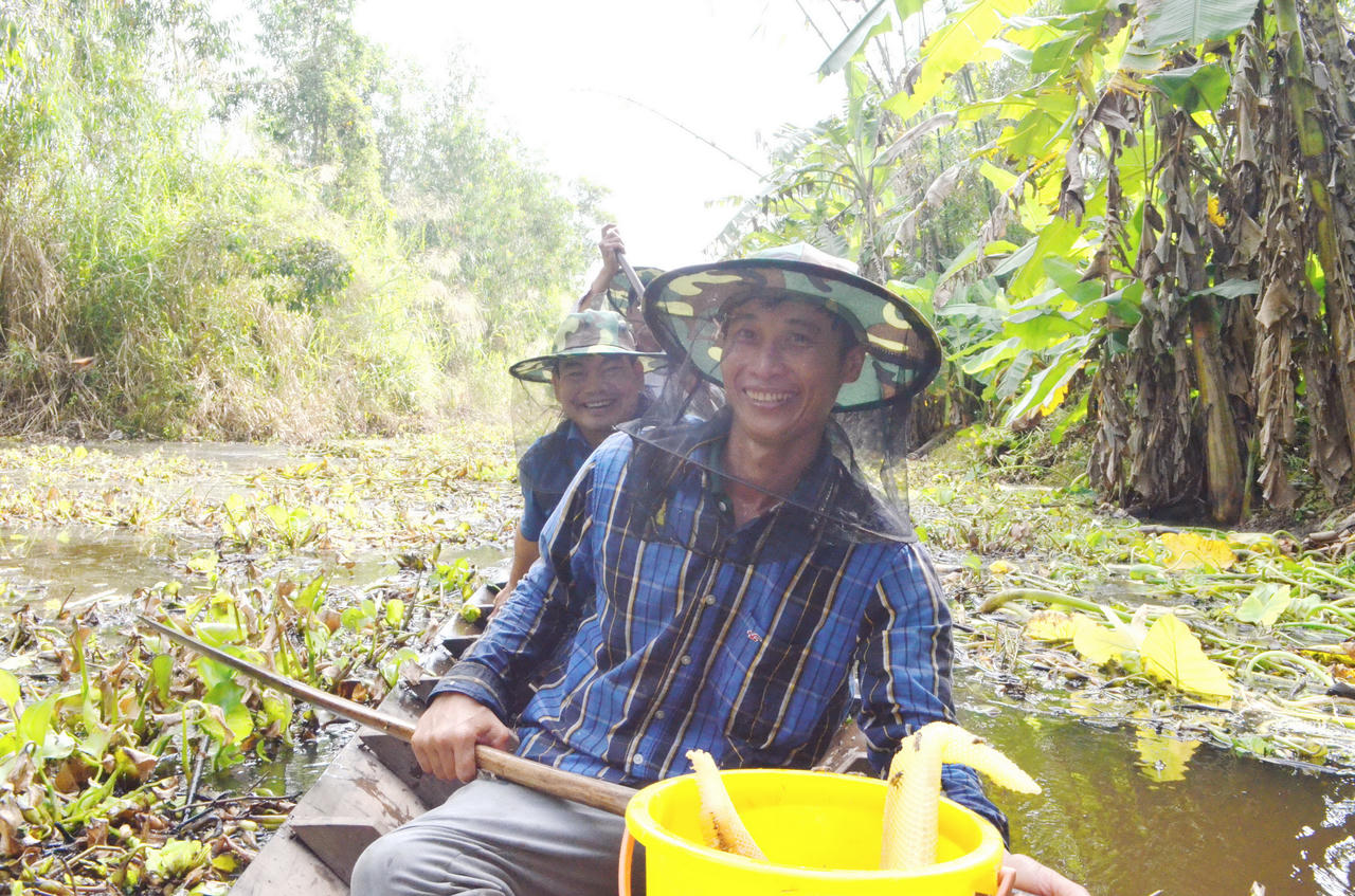 Khoảng 2 - 3 giờ chiều, ông Khanh bơi xuồng ba lá mang theo trúm, dò tìm những bãi cỏ năng, cỏ lác để đặt trúm trong rừng tràm.
