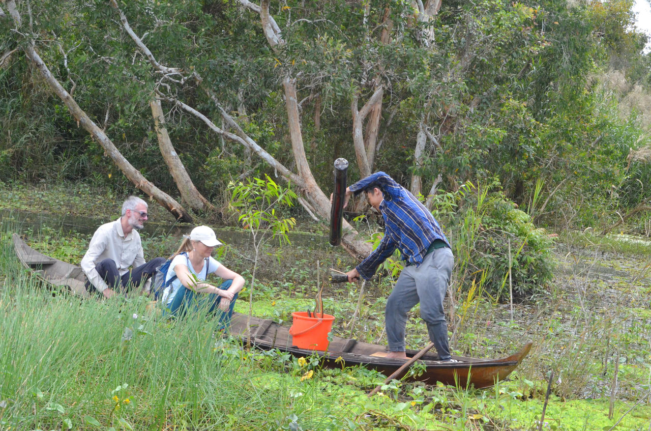 Theo chân ông Phạm Duy Khanh (Chủ khu du lịch sinh thái cộng đồng Mười Ngọt, xã Đá Bạc) và ông Huỳnh Vũ Hoàng – những người có hơn 20 năm gắn bó với nghề – con xuồng máy lướt qua thảm bèo, len sâu vào rừng tràm xanh thẳm.