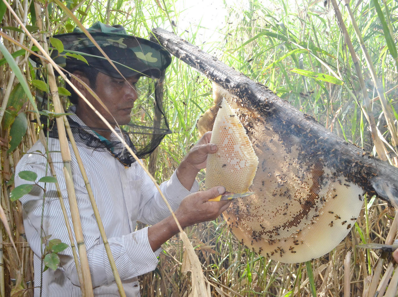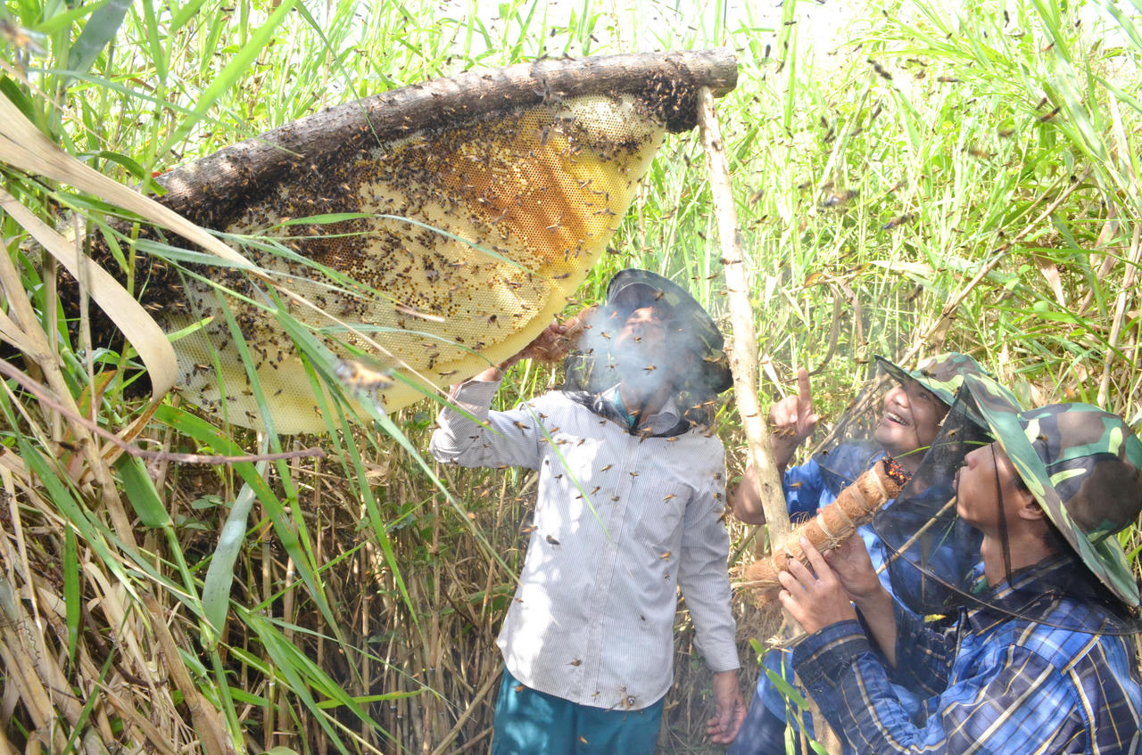 Săn ong thường diễn ra vào sáng sớm, khi sương còn đọng trên lá. Khói đuốc xơ dừa được quơ nhẹ để xua ong, rồi từng miếng tổ vàng óng được cắt gọn gàng.