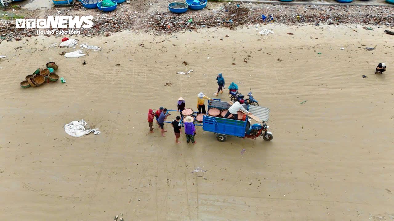 Những ngày gần đây, ngư dân giong thuyền ra khơi từ rạng sáng, đến khoảng 16h thì quay về bờ. Bình quân, mỗi tàu thu được từ 1-2 tấn ruốc. Ngay khi ruốc cập bãi, tiểu thương chèo thúng ra tận nơi thu mua.