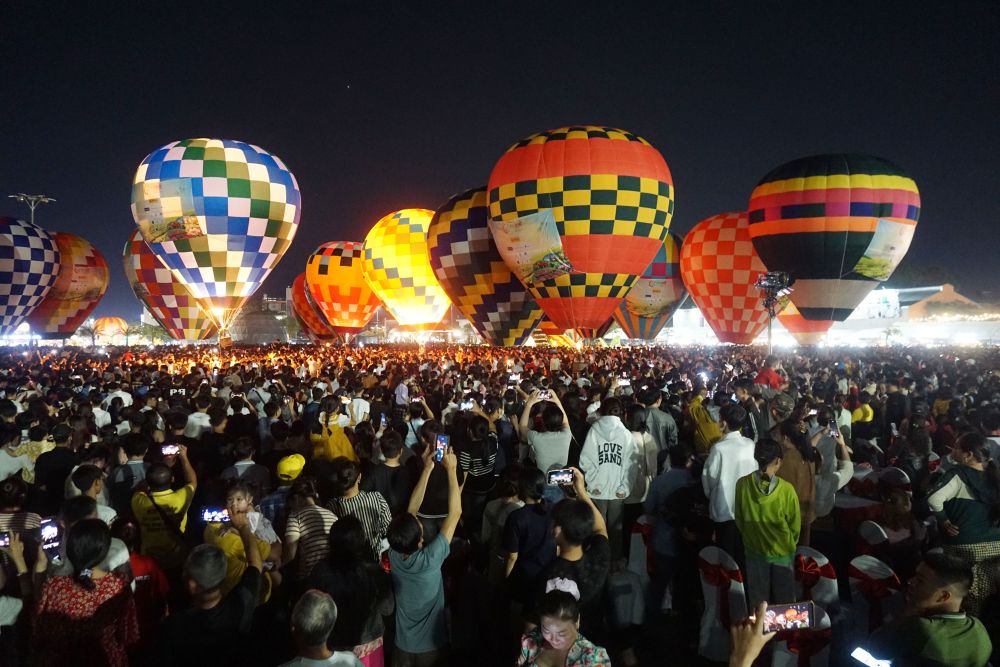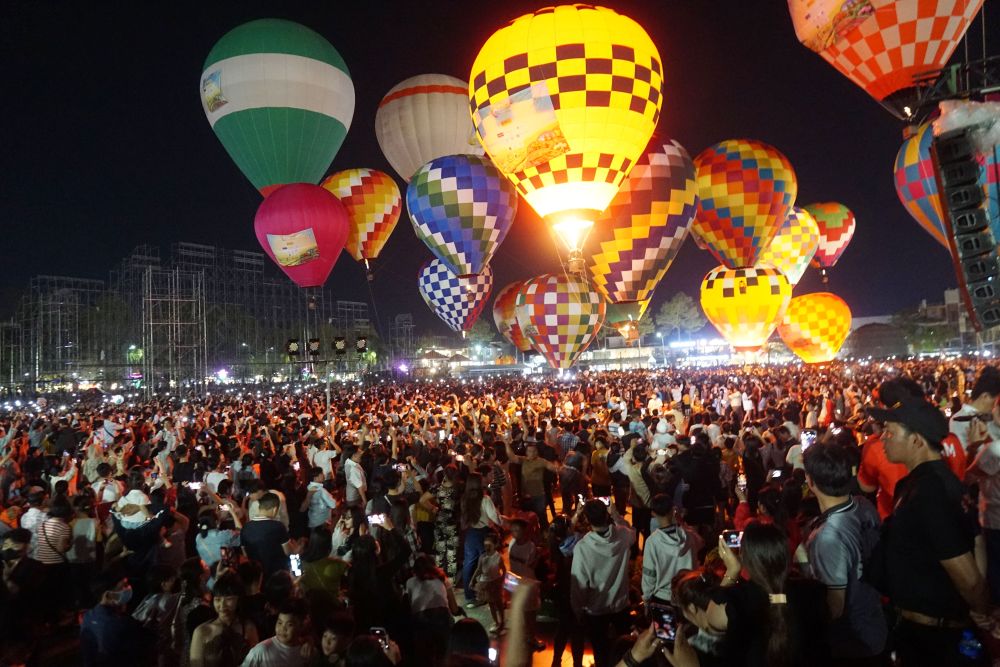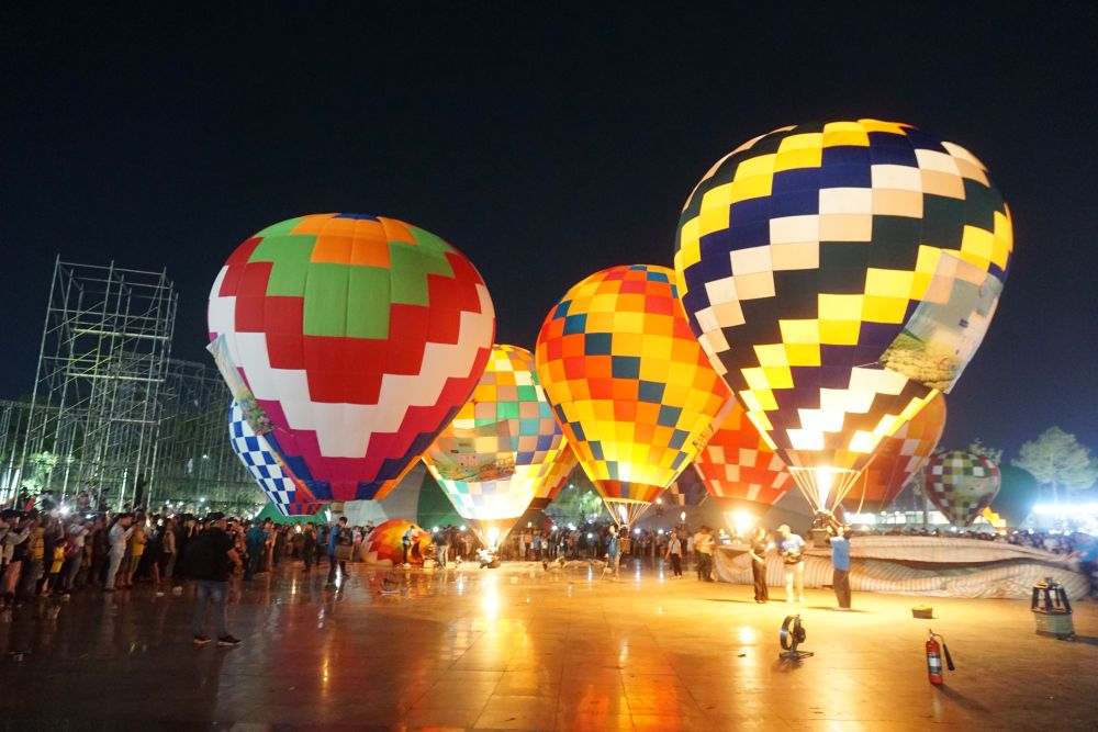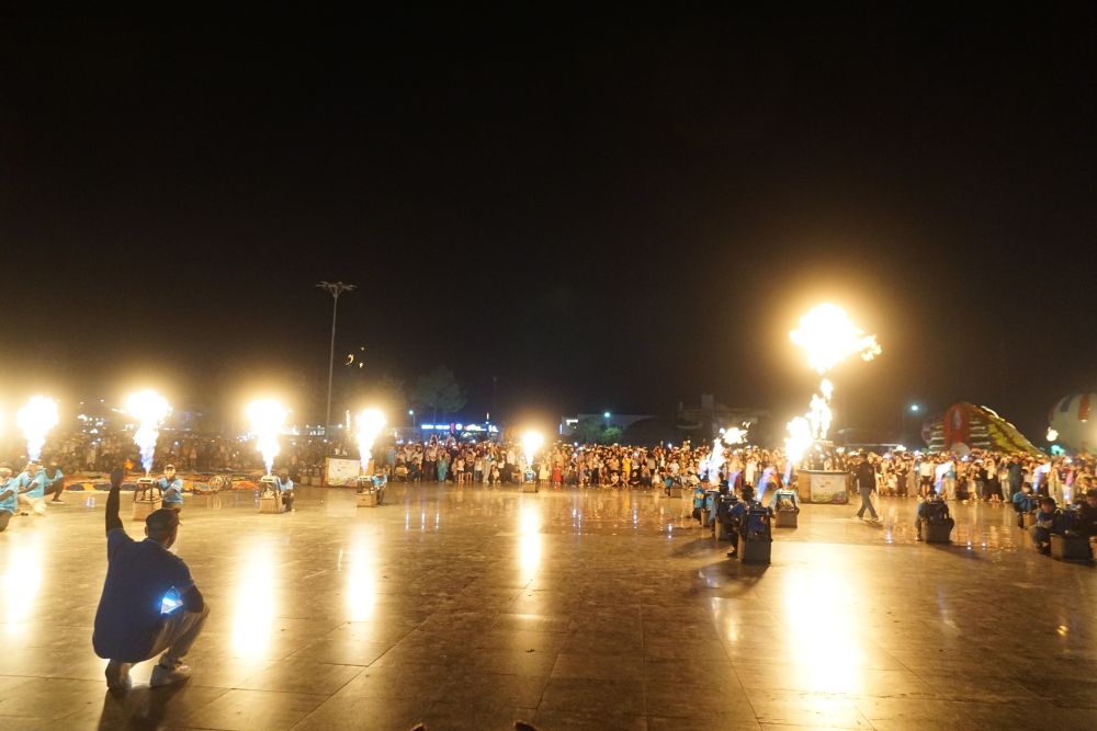 Không khí sôi động tại quảng trường khi du khách mọi lứa tuổi cùng hòa mình vào màn trình diễn ánh sáng và âm nhạc đặc sắc của Đêm hoa đăng khinh khí cầu.