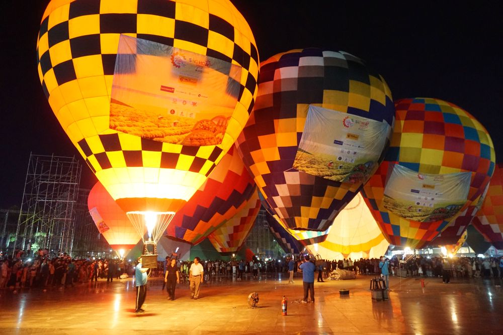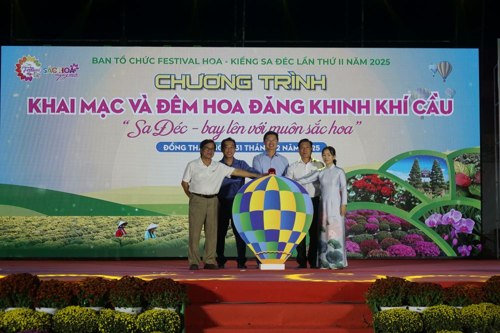 Đồng chí Huỳnh Minh Tuấn – Phó Chủ tịch UBND tỉnh, Trưởng Ban tổ chức Festival cùng các đại biểu thực hiện nghi thức nhấn nút khai mạc Đêm hoa đăng Khinh khí cầu với chủ đề “Sa Đéc – bay lên với muôn sắc hoa”.