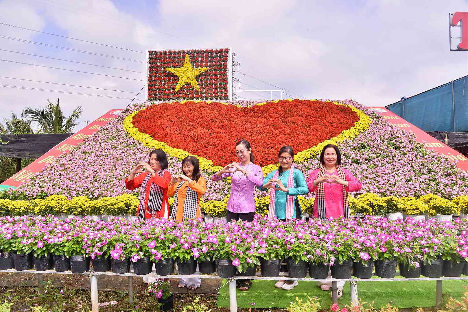 Mô hình trái tim hoa và lá cờ Tổ quốc từ hàng ngàn giỏ hoa thu hút du khách chụp ảnh. Ảnh: Bảo Phong