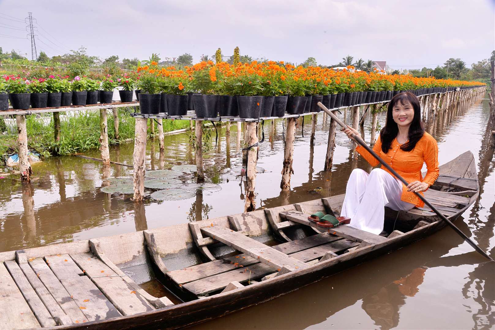 Du khách trải nghiệm bơi xuồng tham quan làng hoa Sa Đéc. Ảnh: Bảo Phong