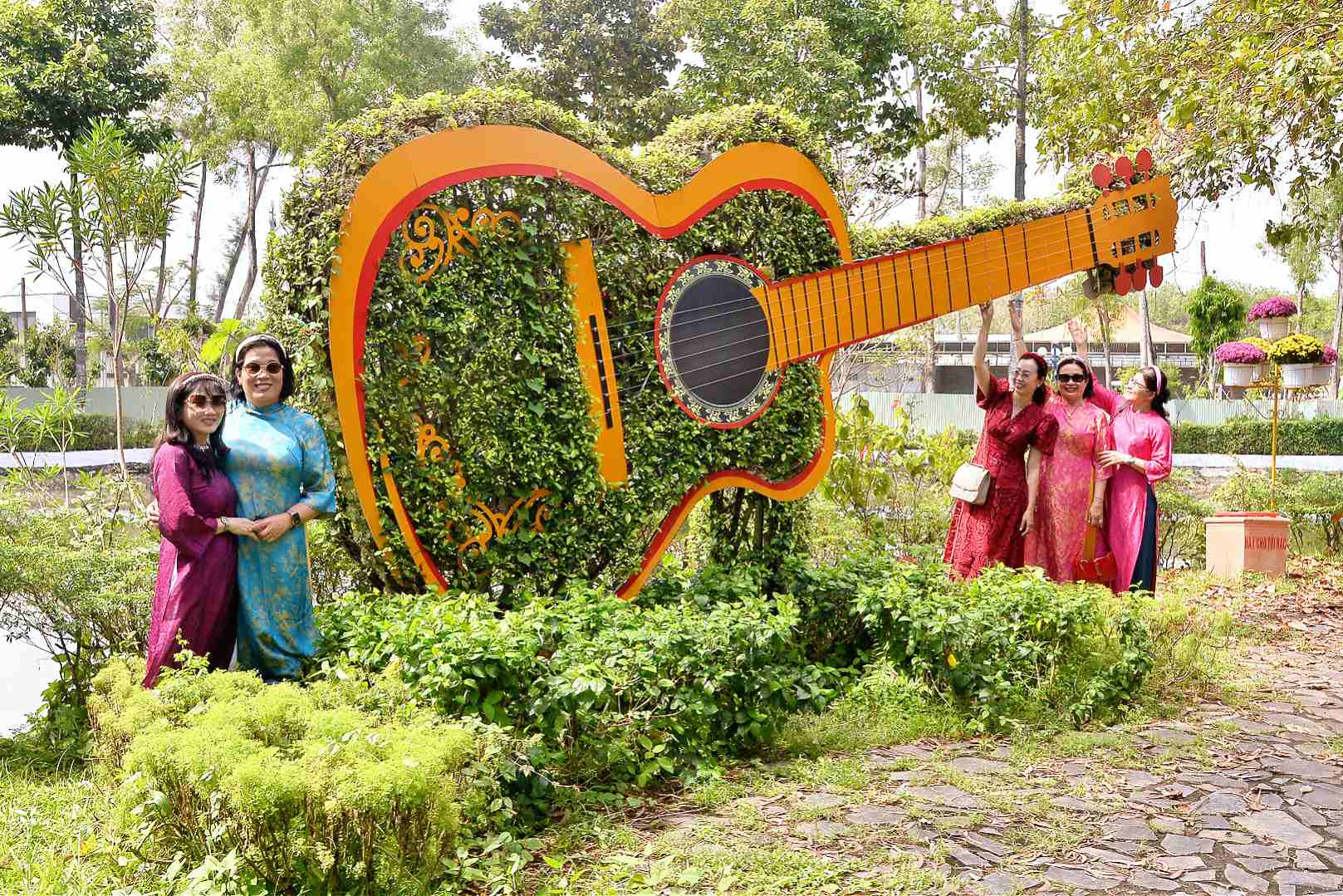 Du khách chụp ảnh bên mô hình đàn guitar tạo hình từ cây kiểng. Ảnh: Bảo Phong