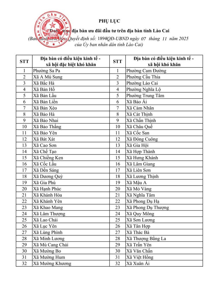 Ngày 7/11, UBND tỉnh Lào Cai ban hành Quyết định số 1894 công bố danh sách địa bàn ưu đãi đầu tư trên địa bàn. Theo đó, có 61 xã, phường thuộc nhóm có điều kiện kinh tế - xã hội đặc biệt khó khăn, 34 xã, phường thuộc nhóm khó khăn. Trong 99 xã, phường của tỉnh, chỉ 4 phường không có tên trong danh sách gồm: Yên Bái, Văn Phú, Âu Lâu và Nam Cường - vốn là trung tâm cũ của TP Yên Bái.