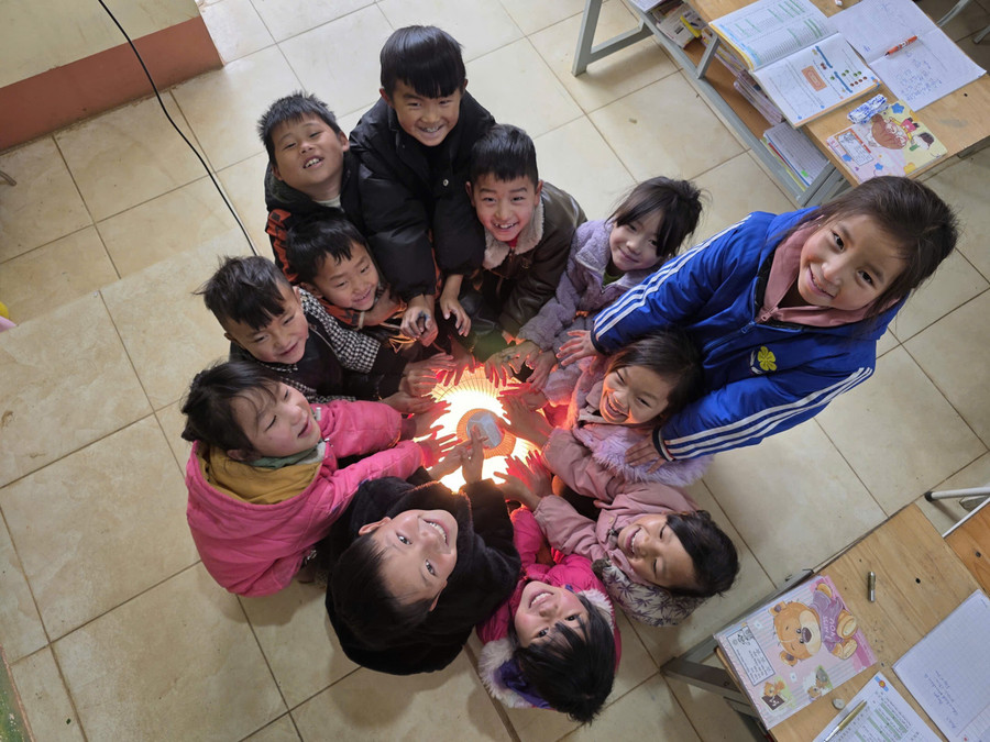 Học sinh Sa Pa quây quần quanh đèn sưởi trong giờ ra chơi tại lớp.