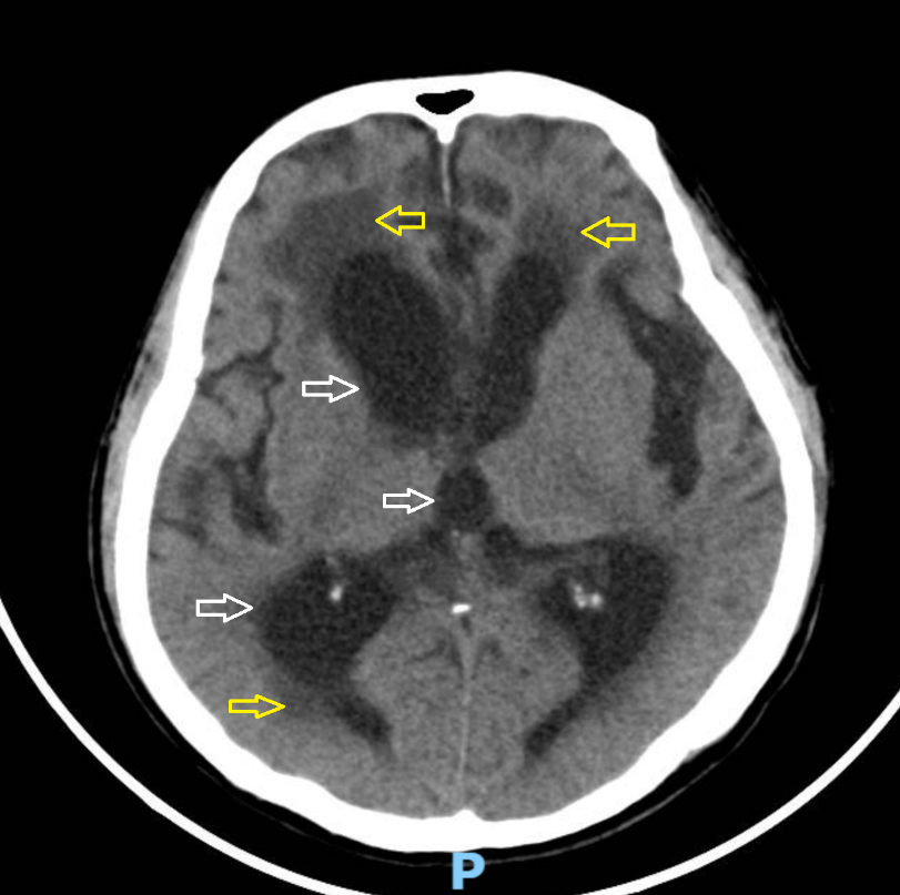 Hình ảnh cắt lớp vi tính của bệnh não úng thủy với dấu hiệu giãn não thất trung bình (mũi tên trắng), ứ dịch não tủy (mũi tên vàng). Ảnh: BVCC