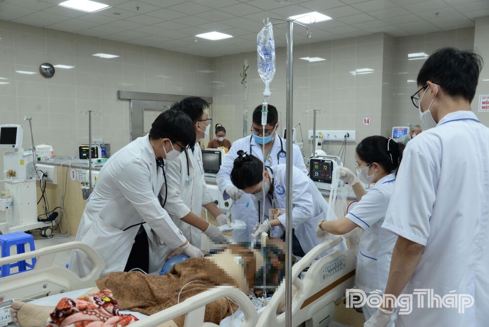 Các y, bác sĩ kiểm tra tình trạng bệnh nhân bị tai nạn giao thông tại Khoa Hồi sức Cấp cứu, Bệnh viện Đa khoa Tiền Giang.