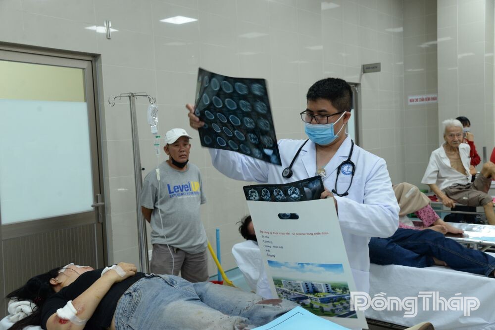 Bác sĩ chuyên khoa 1 Nguyễn Lê Huyên kiểm tra tình trạng bệnh nhân bị tai nạn giao thông tại Khoa Hồi sức Cấp cứu, Bệnh viện Đa khoa Tiền Giang.