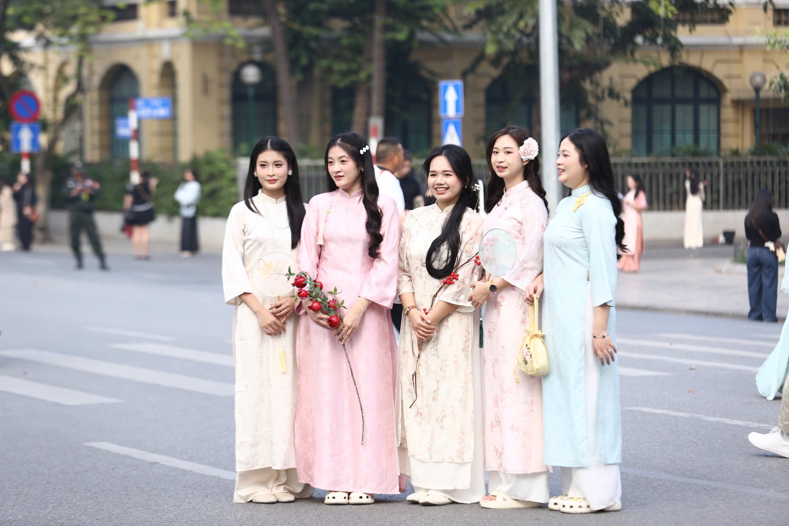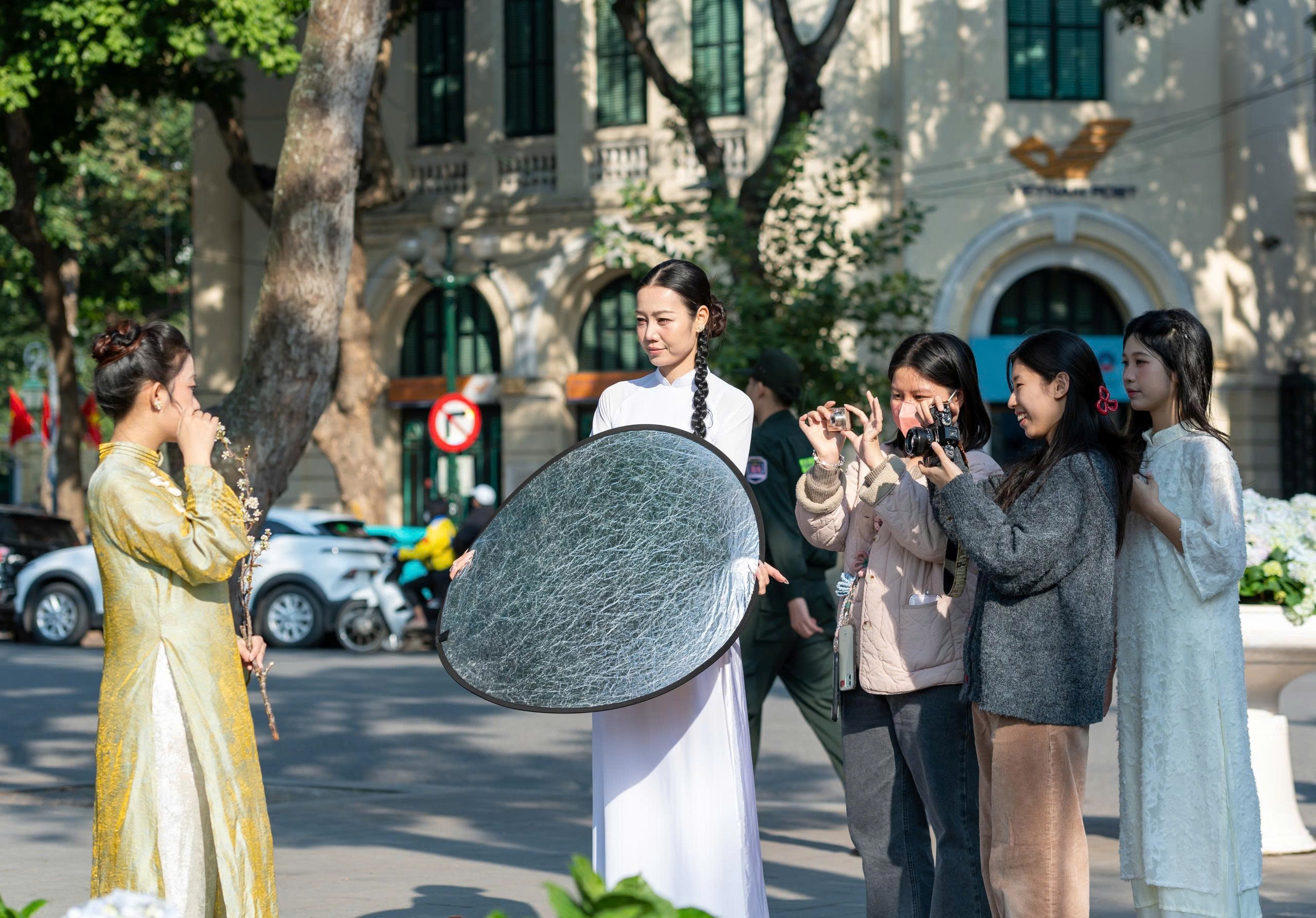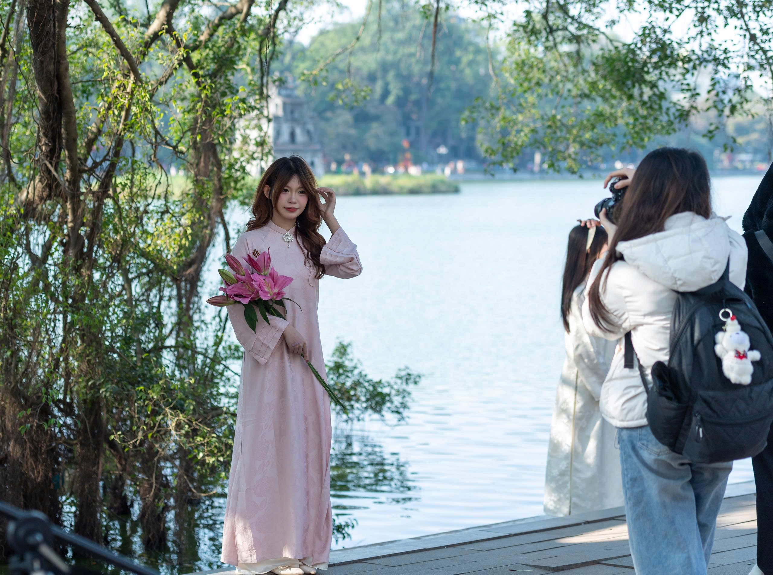 Dưới nắng sớm trong trẻo, gió se se nhẹ, những hàng cây Liễu rủ bóng xuống mặt hồ xanh ngắt. Hồ Gươm đã nhộn nhịp bước chân của các du khách diện áo dài đủ sắc màu, tạo nên bức tranh sinh động, rộn ràng, vừa mang hơi thở mùa xuân vừa tôn vinh vẻ đẹp văn hóa giữa lòng Thủ đô.