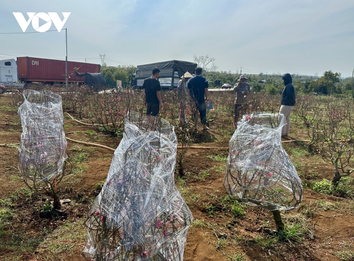 Nhiều vườn đào của Hợp tác xã thương mại dịch vụ hoa đào Buôn Hồ, tỉnh Đắk Lắk đã được thương lái chốt mua sớm.
