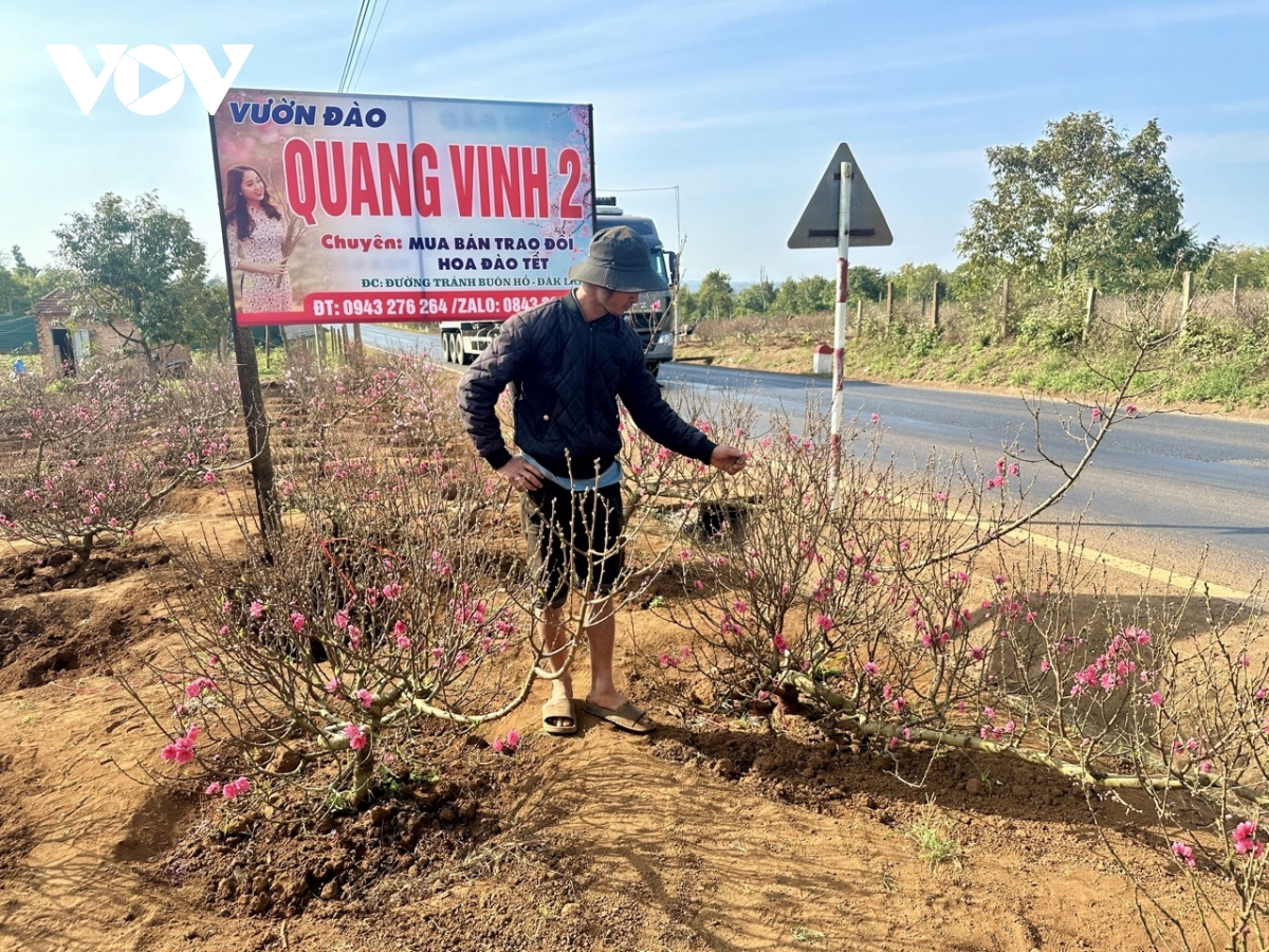 Năm nay, thời tiết Tây Nguyên được đánh giá khá thuận lợi cho cây đào sinh trưởng và ra hoa; nụ đều, bông to và màu sắc tươi tắn hơn mọi năm. Ông Nguyễn Văn Tiến, người trồng đào tại phường Buôn Hồ, tỉnh Đắk Lắk cho biết, vườn của ông chủ yếu là giống đào Nhật Tân, với 2 tông màu, hồng phai nhẹ nhàng và đỏ bích rực rỡ, và đều được thương lái chốt cả vườn.