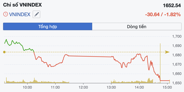 Kết phiên, VN-Index giảm 30,64 điểm (-1,82%) xuống 1.652,54 điểm, VN30-Index mất gần 44 điểm, còn HNX-Indexgiảm 0,72% còn 265,36 điểm. Riêng UPCoM-Index giữ được sắc xanh nhẹ, tăng 0,33% lên 111,24 điểm.