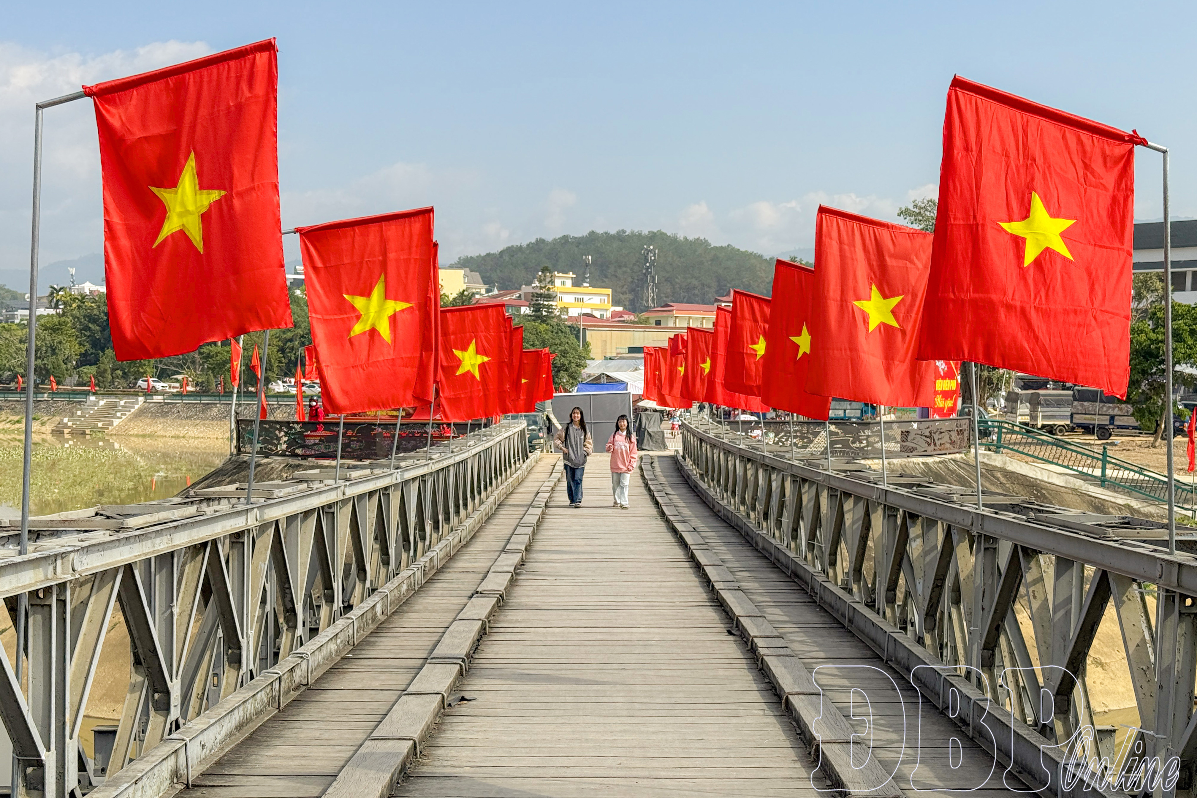 Di tích cầu Mường Thanh trang hoàng với hàng cờ Tổ quốc.