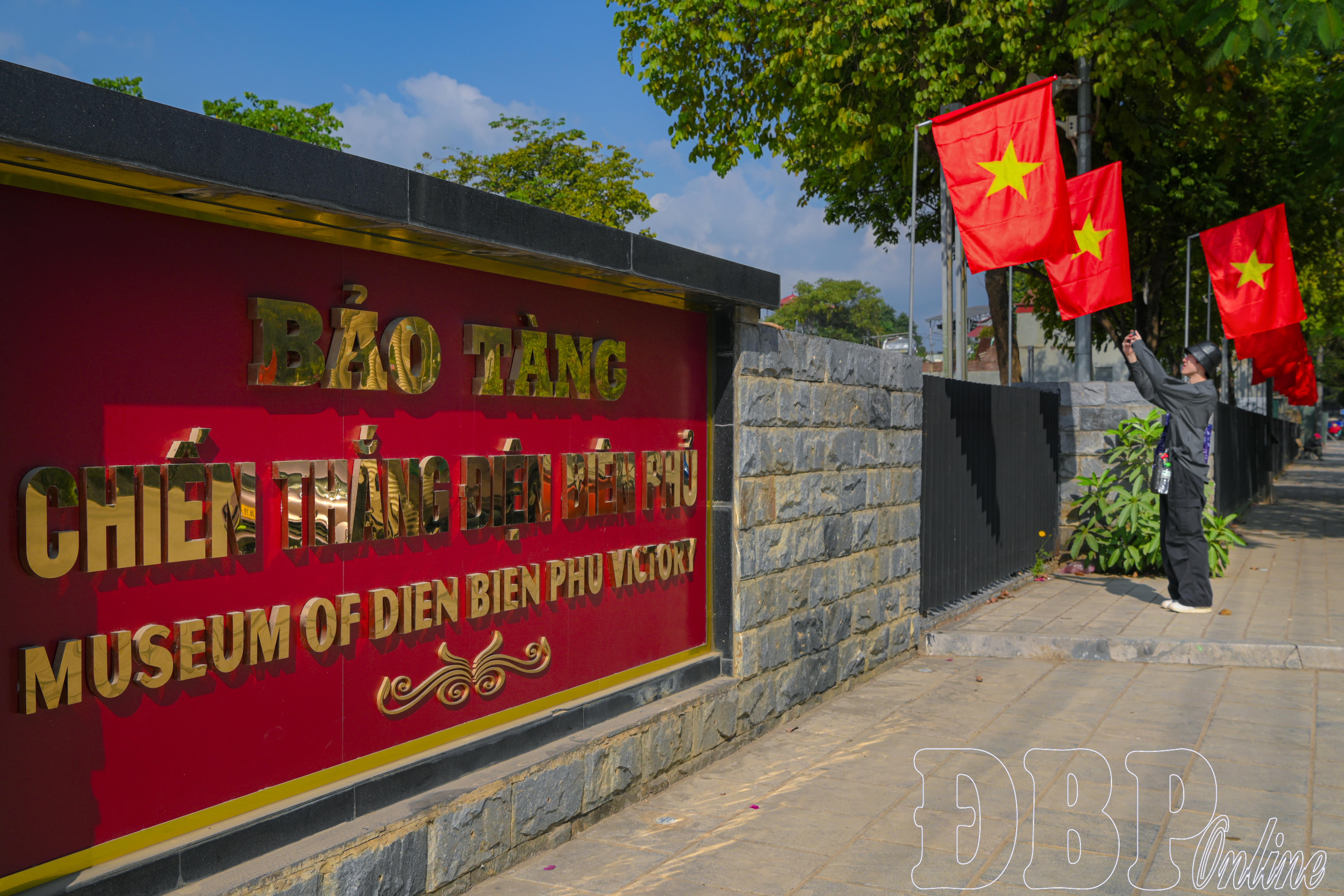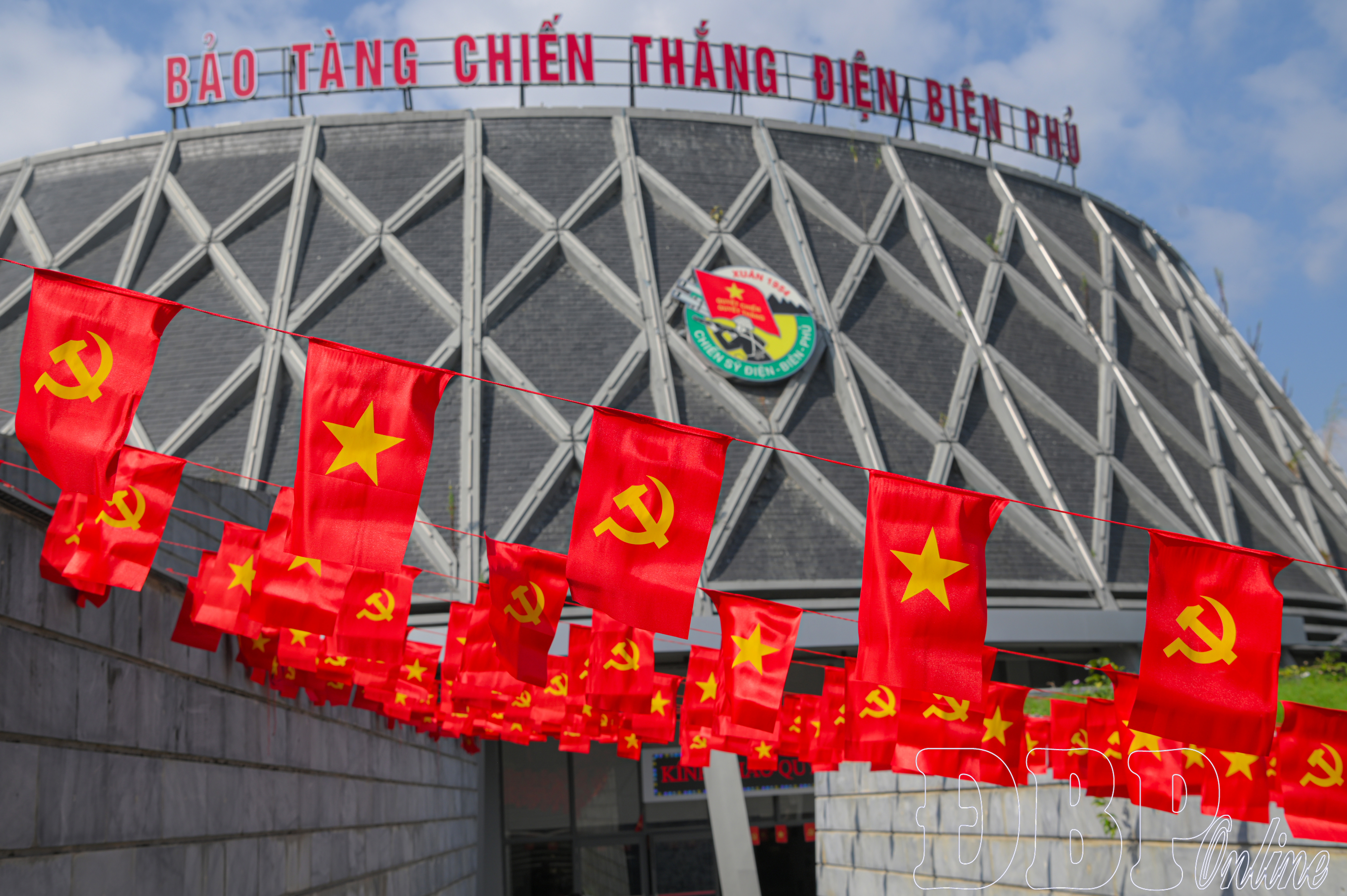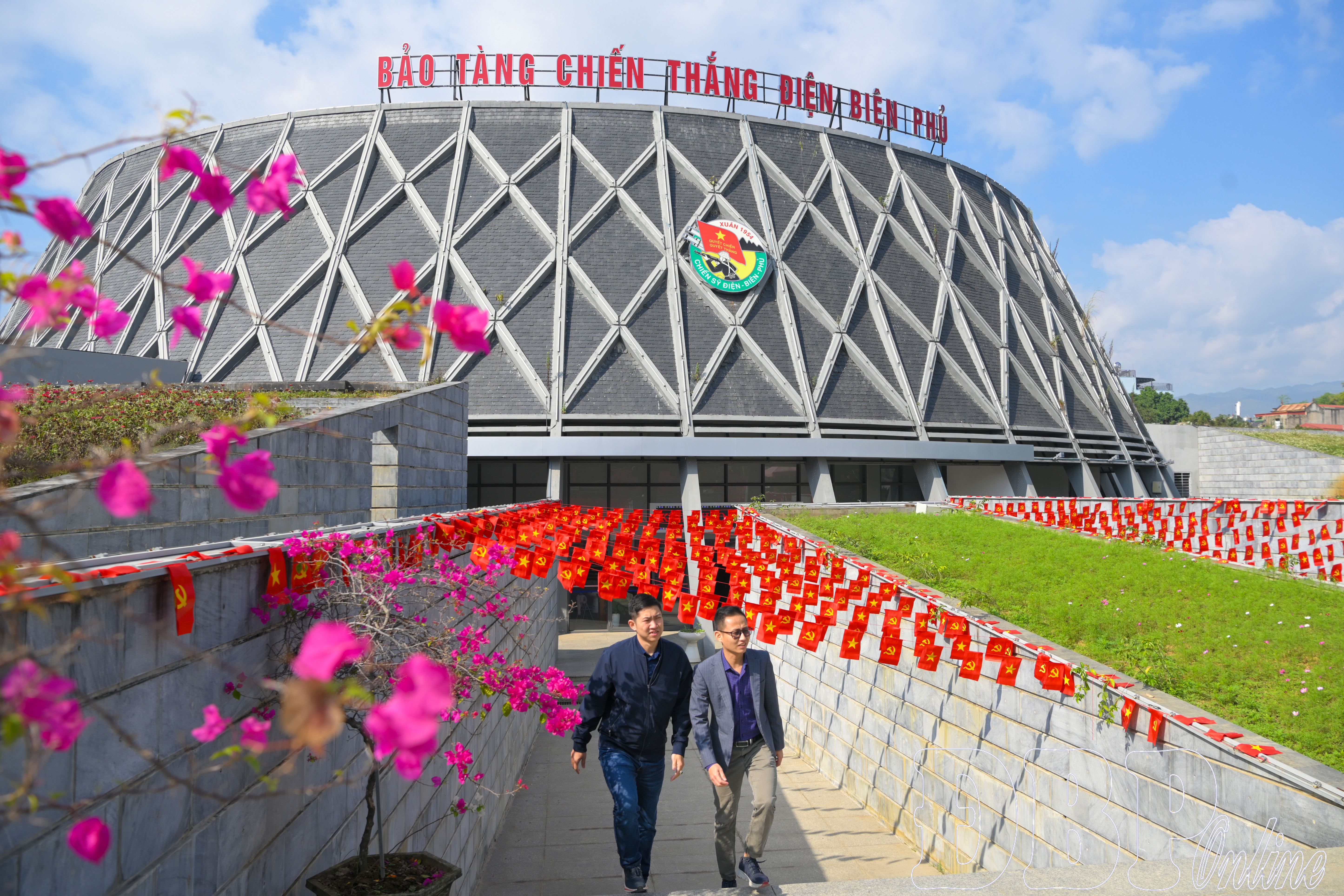 Bảo tàng Chiến thắng Điện Biên Phủ trang trí kết hợp cờ, hoa tươi và các yếu tố trang trí cảnh quan.