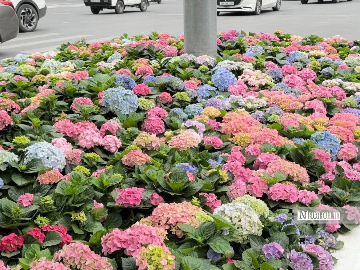 Những ngày này, người dân Thủ đô không khỏi ngỡ ngàng khi đi ngang qua tuyến phố Trần Duy Hưng. Thay vì vẻ hối hả, bụi bặm thường thấy, dải phân cách dọc tuyến đường bỗng trở nên thơ mộng lạ thường khi hàng nghìn đóa hoa cẩm tú cầu bước vào độ nở rộ nhất, bung nở thành từng khóm tròn đầy, mềm mại.